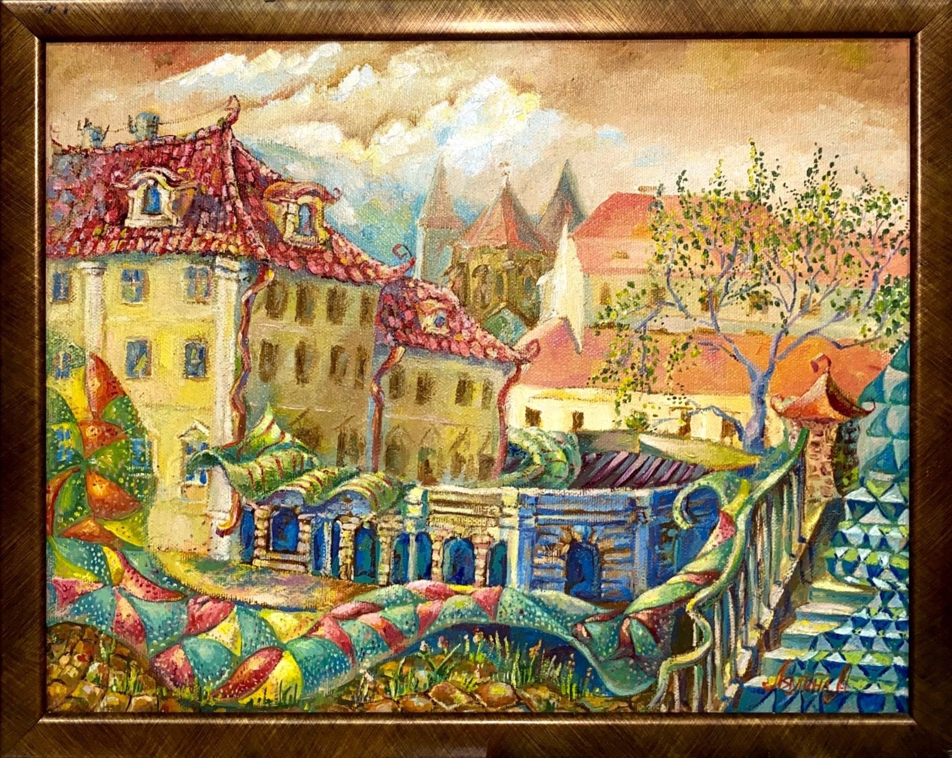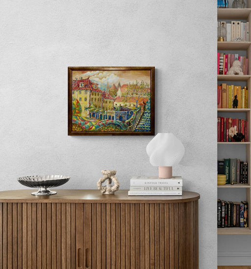 Enchanted Village is a richly detailed and whimsical painting that breathes life into a charming townscape. The scene is filled with fantastical architecture, where the buildings have flowing, almost organic lines, as if they are swaying to a gentle breeze. The vibrant red roofs curl and twist, lending a fairy-tale quality to the village. In the foreground, colorful quilt-like patterns wrap around walls and pathways, creating a tapestry effect that merges nature and architecture. Delicate trees and playful foliage add to the dreamlike atmosphere, while distant spires and rooftops peek through a soft, cloudy sky. This artwork transports viewers to a magical realm where every element feels alive and animated, blending fantasy with the warmth of a quaint village.