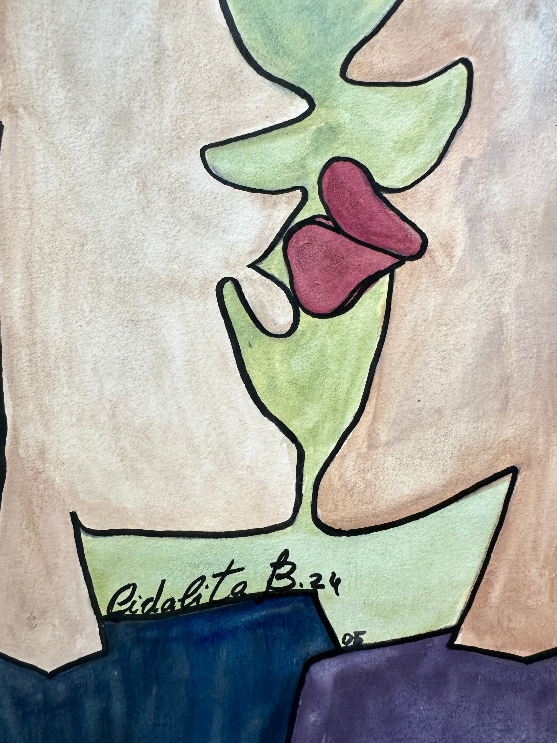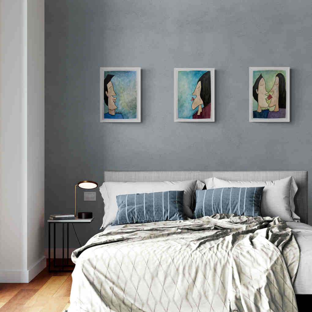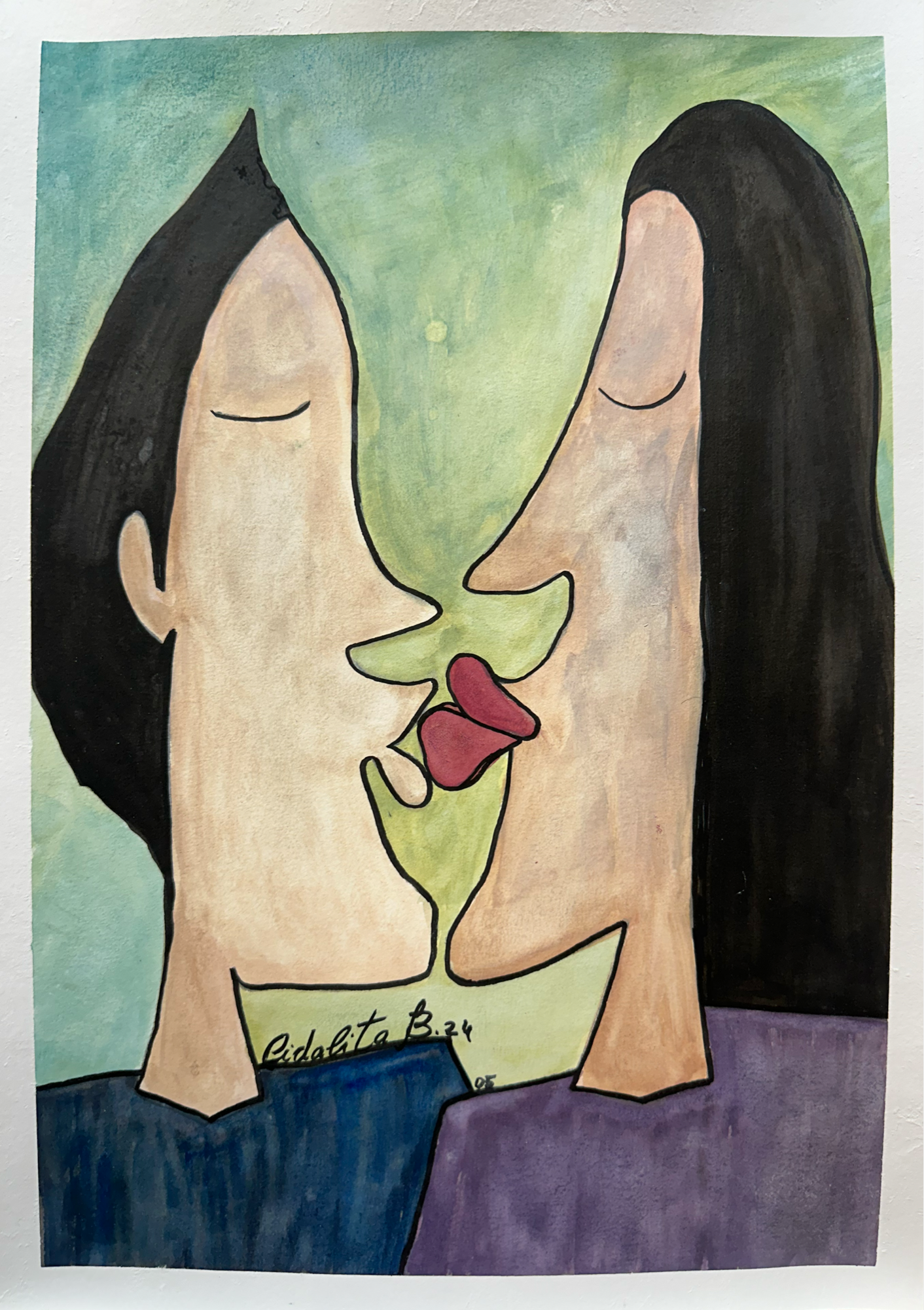 Two abstract figures converge in a gentle kiss, their features simplified and stylized to focus on the act of affection itself. This piece uses soft watercolor tones to enhance its tender emotion.