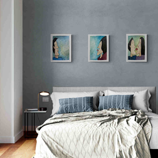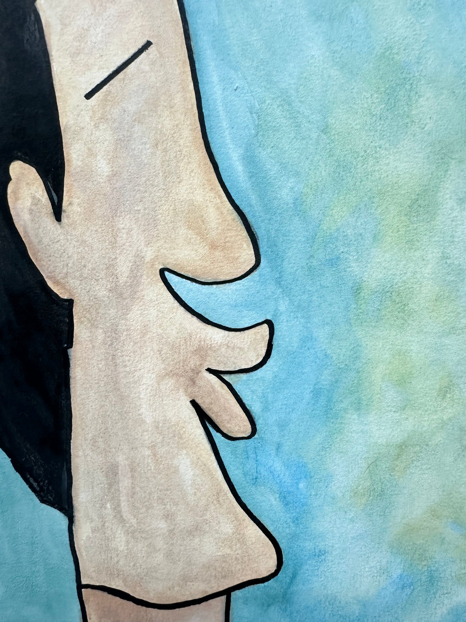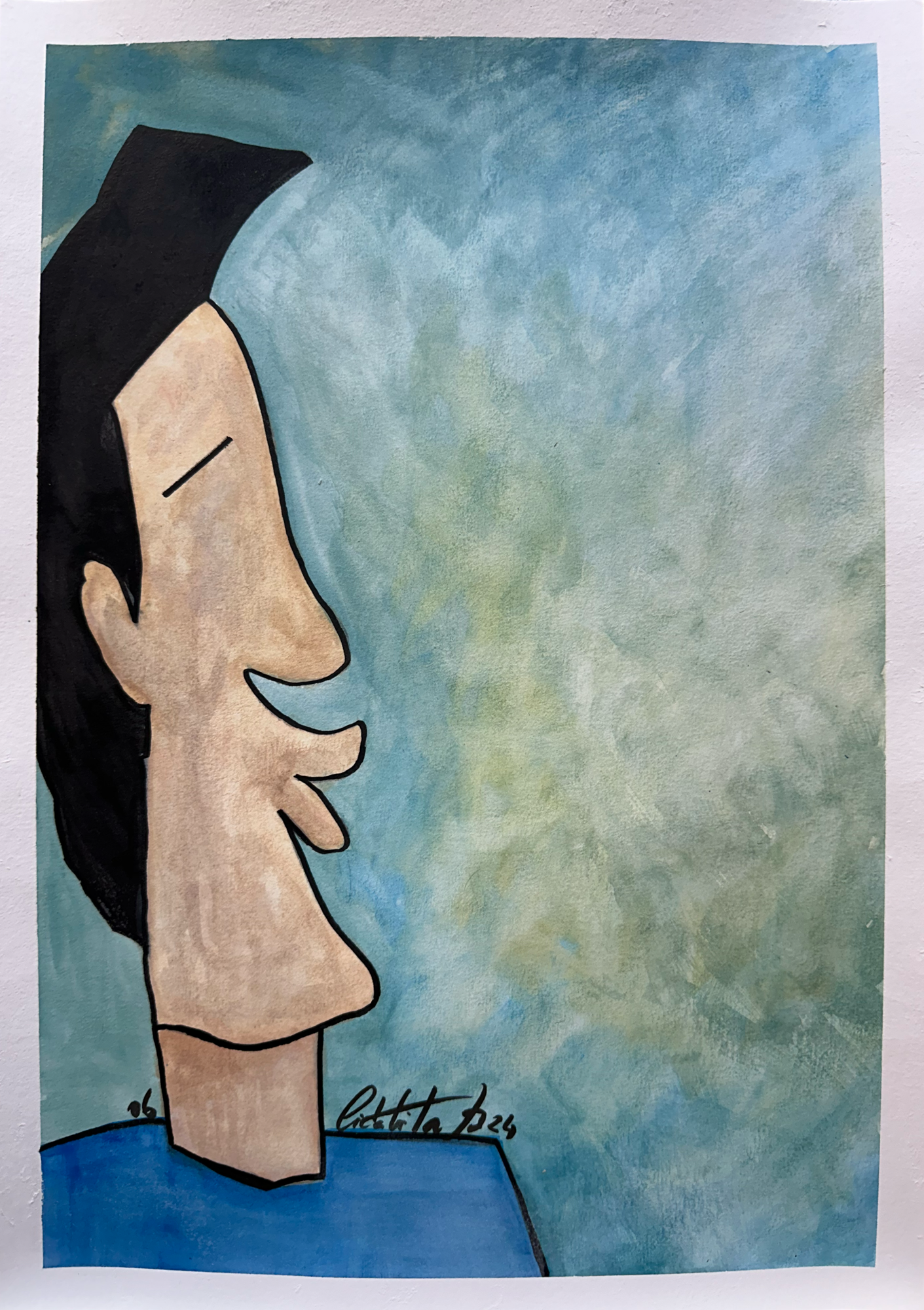 A profile of a serene figure set against a cool blue background, exemplifying tranquility and solitude. The use of minimal colors and simple lines highlights the calm demeanor of the subject.