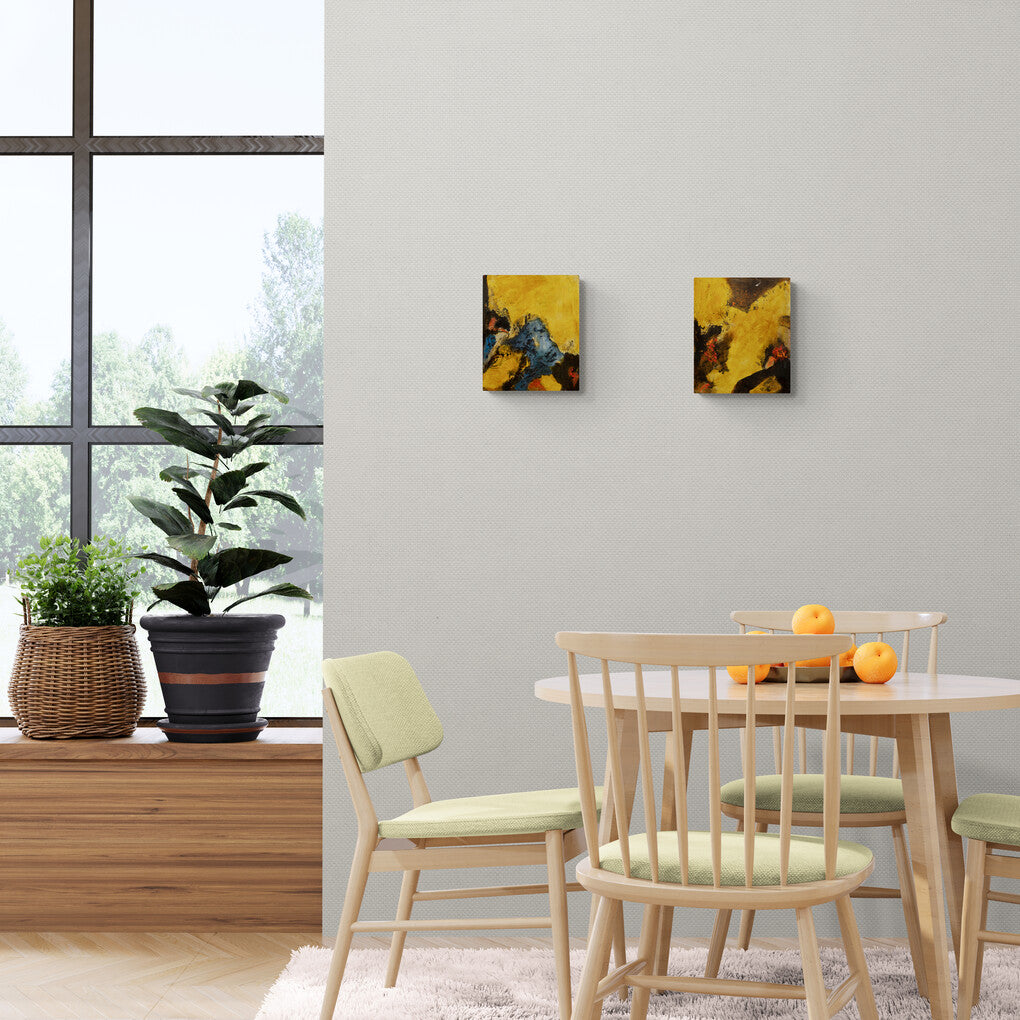 This abstract artwork presents a bold composition with intense colors and textured surfaces. The dominant blue and yellow hues, accented with touches of red and black, create a sense of raw energy and spontaneous eruption. The thick, expressive brushstrokes and layered textures convey the intensity and power of natural forces, capturing a moment of dynamic transformation.