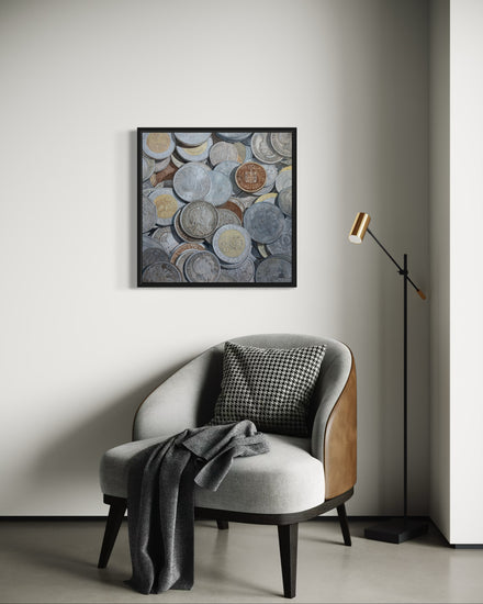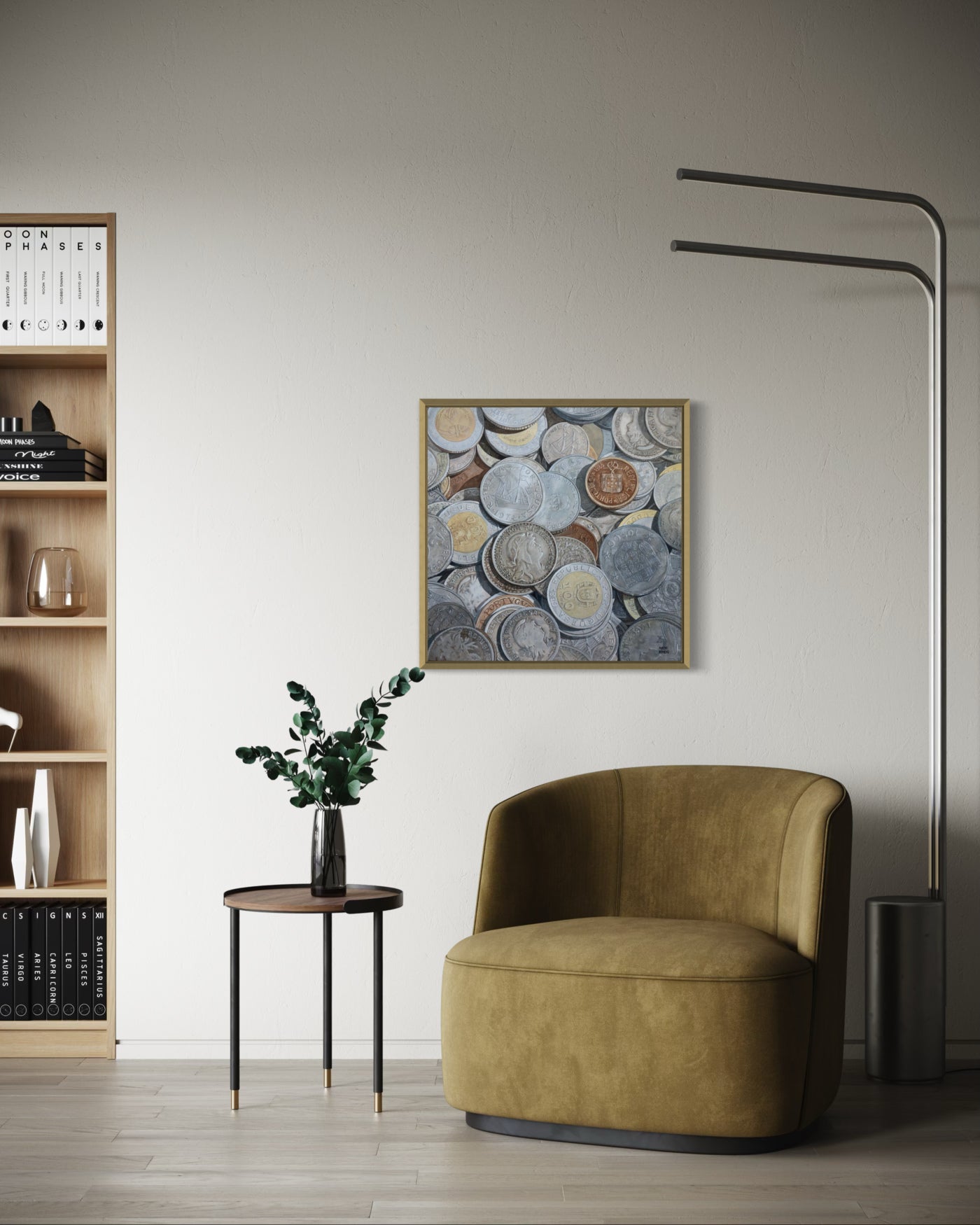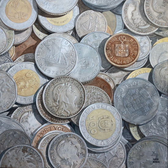 A hyper-realistic painting depicting a collection of vintage Portuguese escudos. The intricate details of each coin, from their worn surfaces to engraved patterns and symbols, evoke a sense of nostalgia and historical richness.