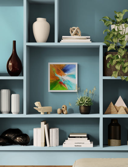 A bold and dynamic piece that explores the fusion of contrasting color fields. The composition appears to swirl and converge towards a central, radiant point, where warm oranges and cool blues collide, creating a sense of motion and intensity. The lower portion is dominated by lush greens, suggesting a connection to nature, while the upper right corner bursts into vibrant shades of blue, evoking the expanse of the sky or water. The brushstrokes are energetic and sweeping, pulling the viewer into the center of the action, while the bright white highlights add an element of light and clarity. The painting conveys the beauty of opposing forces coming together, creating a harmonious and balanced energy.