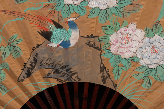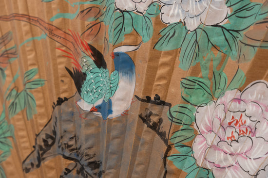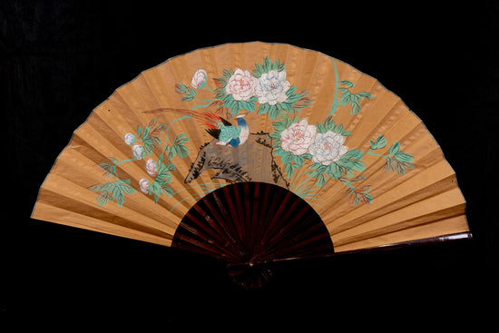 "Eternal Blossom" captures the delicate essence of Eastern artistic tradition through its hand-painted fan adorned with lush peonies and an ethereal bird. This artwork merges traditional craft with fine art, offering a glimpse into a serene, naturalistic setting that embodies tranquility and beauty. The meticulously painted flowers and bird against the warm, earthy tones of the fan provide a classic yet timeless appeal.