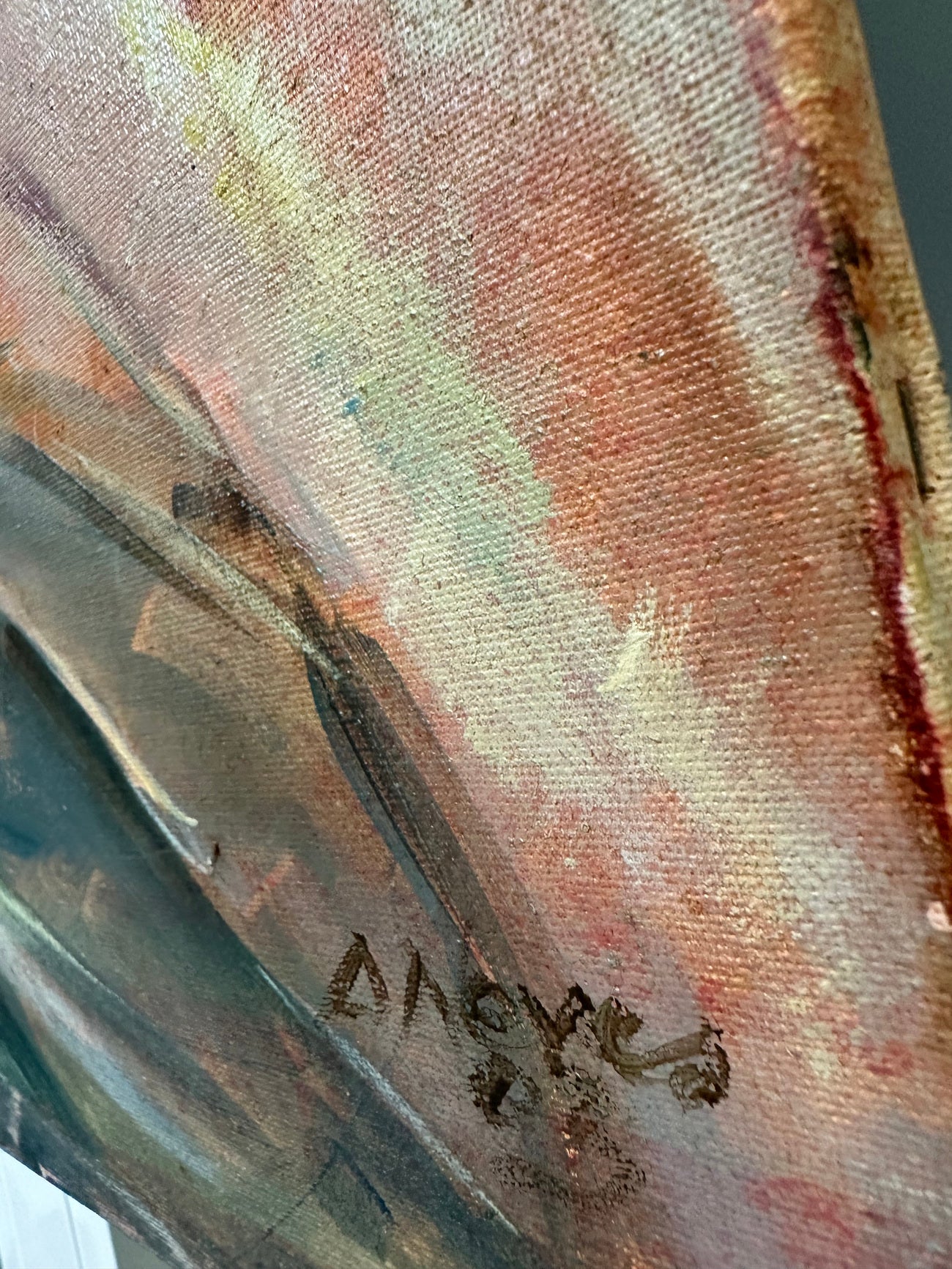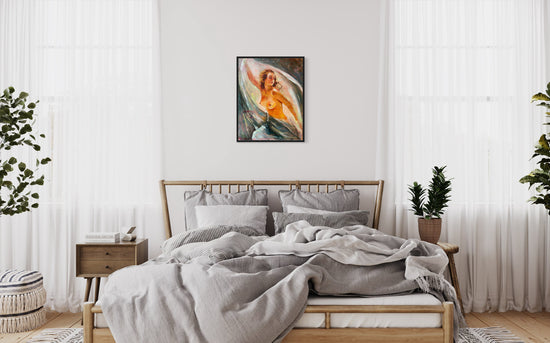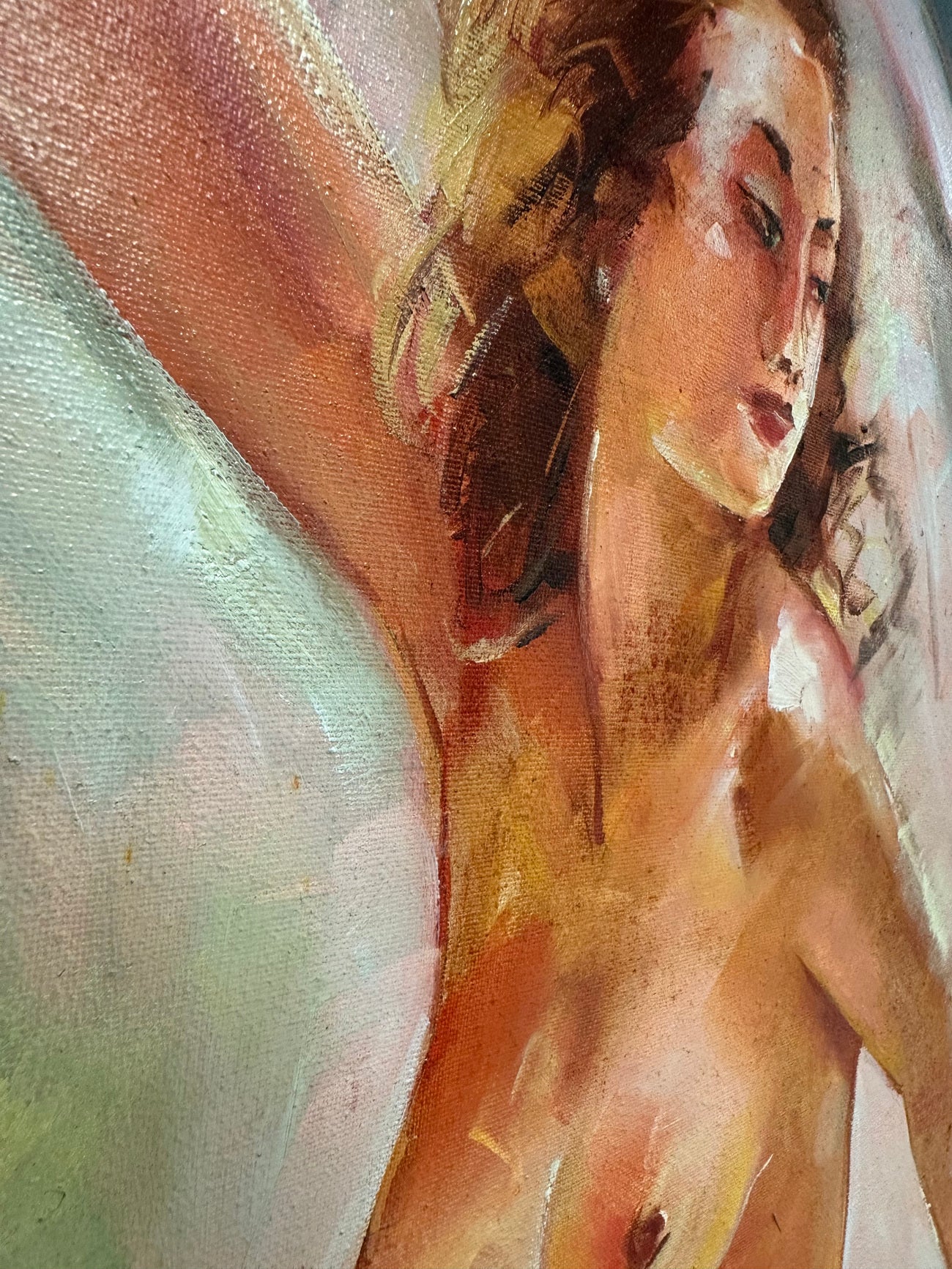 The painting captures a woman in a moment of serene elegance, her posture both relaxed and poised. The warm tones of her skin contrast with the cooler, diffused hues of her surroundings. Her gaze is turned away, lending her an air of contemplation or introspection.