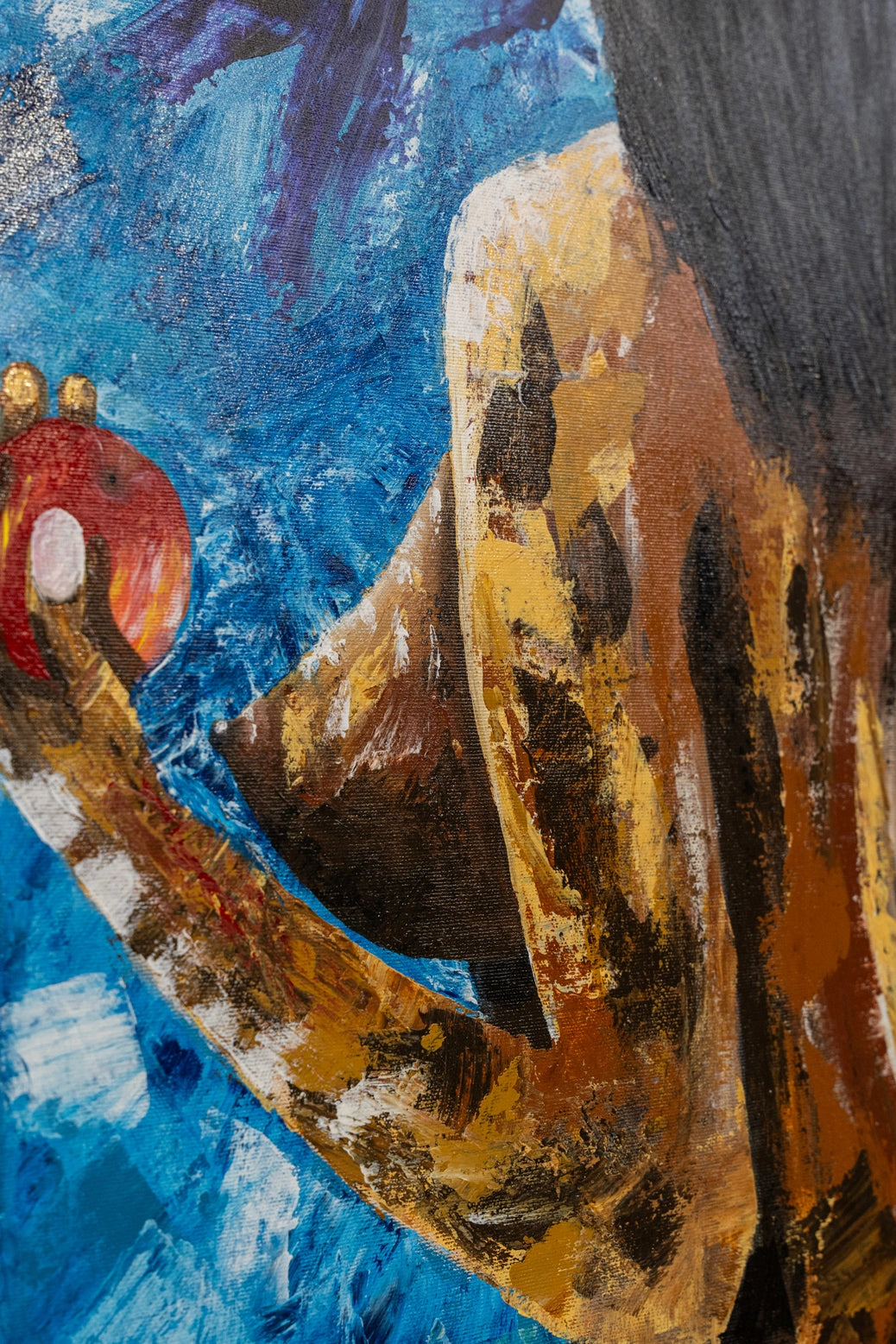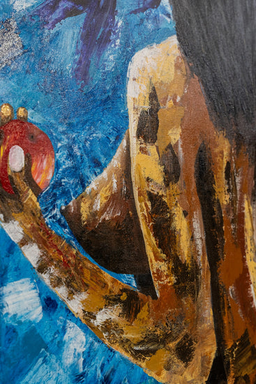Her form is rendered with textured brushstrokes in earthy tones of gold and brown, contrasting with the lively blues and whites of the abstracted background.