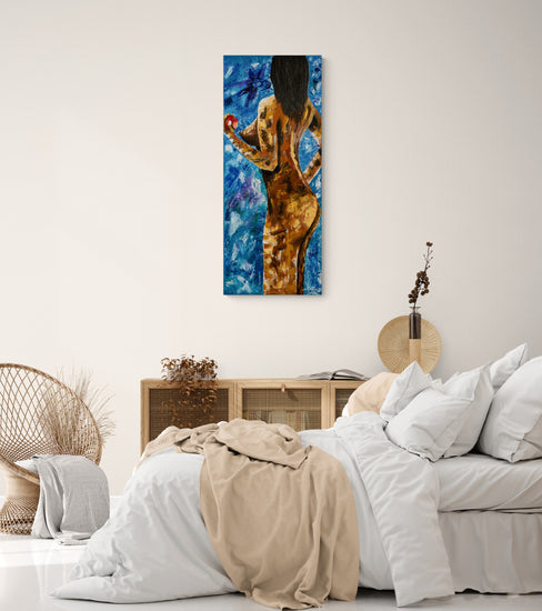 This expressive painting depicts a figure of a woman from behind, looking over her shoulder. She holds an apple in her hand, evoking the biblical theme of Eve.