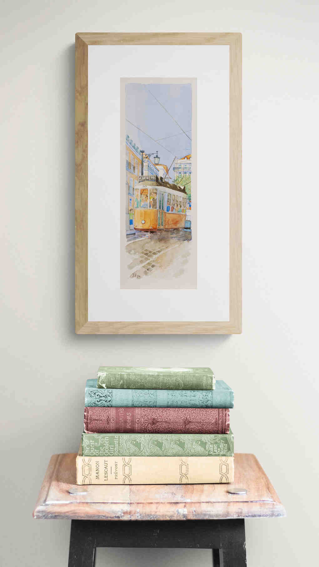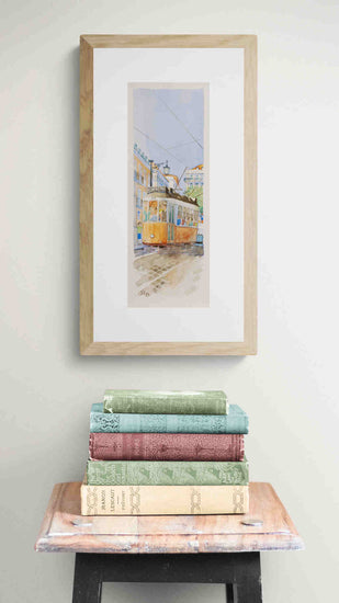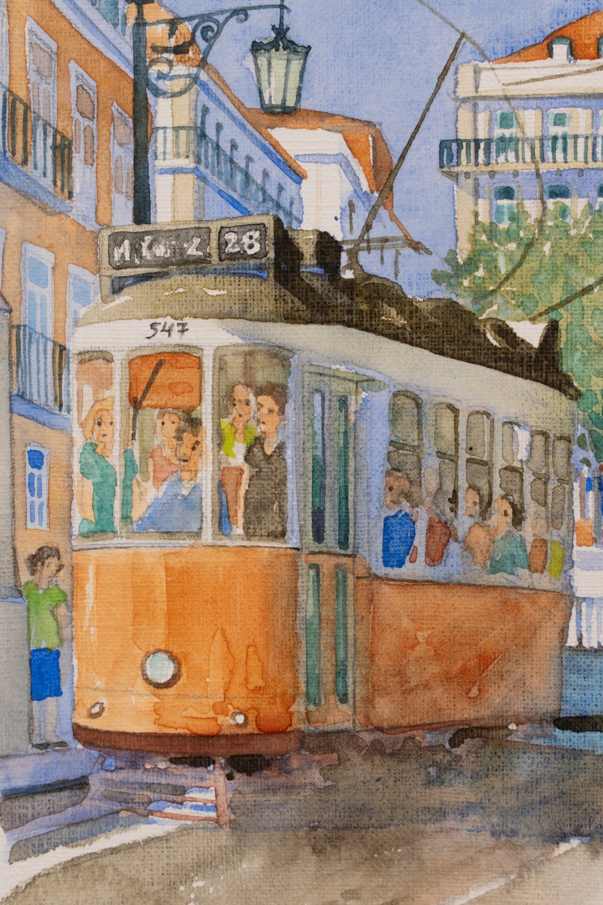 In this scene, a tram moves through the city under a dramatic evening sky. The use of blue hues and the detailed rendering of light and shadows convey the end of a busy day, with passengers aboard heading to their destinations.