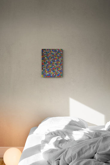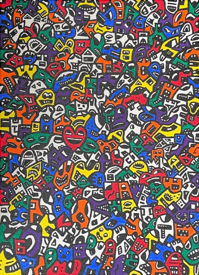 This intricate painting is a whirlwind of colorful, abstract shapes and forms. A myriad of small, interlocking figures in vibrant reds, greens, blues, yellows, and purples create a dense, energetic composition. The chaotic arrangement of shapes and the playful use of color evoke a sense of dynamic movement and complexity, drawing the viewer into a lively, bustling world.