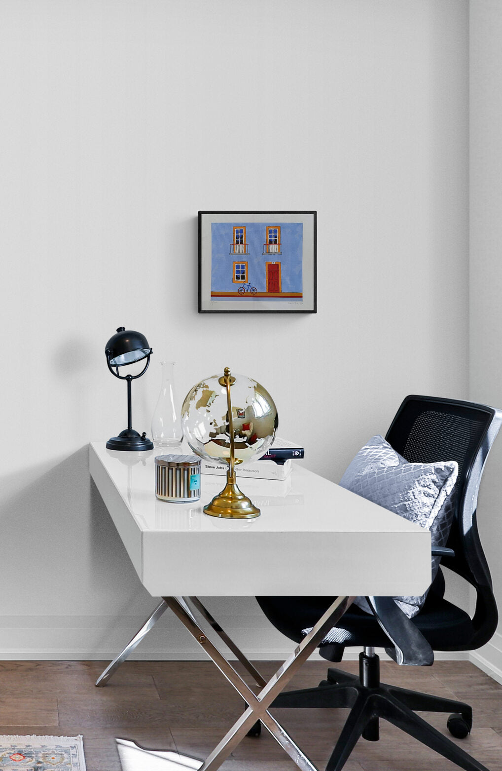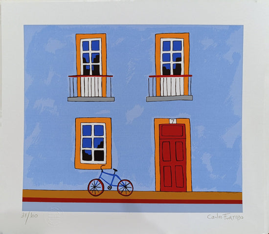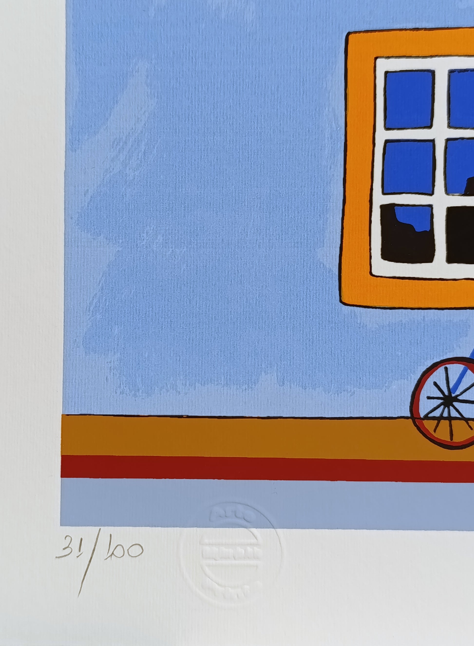 Blue Sky Edition radiates with simplicity and charm. The light blue background symbolizes a clear sky, perfectly framing the bold orange window frames and a red door, capturing a playful yet peaceful urban scene. The blue bicycle adds a whimsical touch to this otherwise minimalist composition, evoking a sense of nostalgia and leisurely days. This limited edition print is ideal for lovers of modern, urban-inspired decor, bringing a cheerful and vibrant atmosphere into any space.