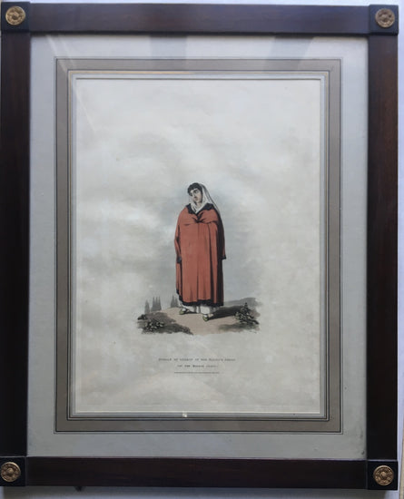 Female of Lisbon in Her Walking Dress -OF the Middle Class- Aquatinta of rev. William Bradford. Framed 96 x 55 cm London, Published by J. Both Duke- Street Portland Place- May 22, 1809 Sketches of the country, character, and custom, in Portugal and spain, Made During the Campaign, and on the route of the British Army, in 1808 and 1809 / funced and coloud from the draws by the Rev. William Bradford… Reverend William Bradford (1780-1857) was a military chaplain and accompanied Wellington forces in the peninsular campaign against Napoleon's troops; His drawings were perfected and recorded by J. Clark to illustrate one of the most beautiful books about Portugal and Spain published in the nineteenth century. Variant of the 1810 edition. The first part contains 39 colorful water-tights at hand, representing, above all, popular straps and cities views. The second includes 13 colorful waters, with military uniforms