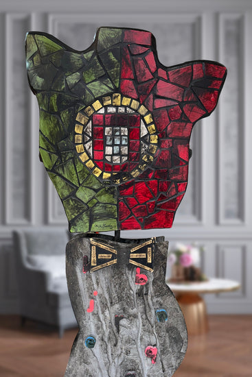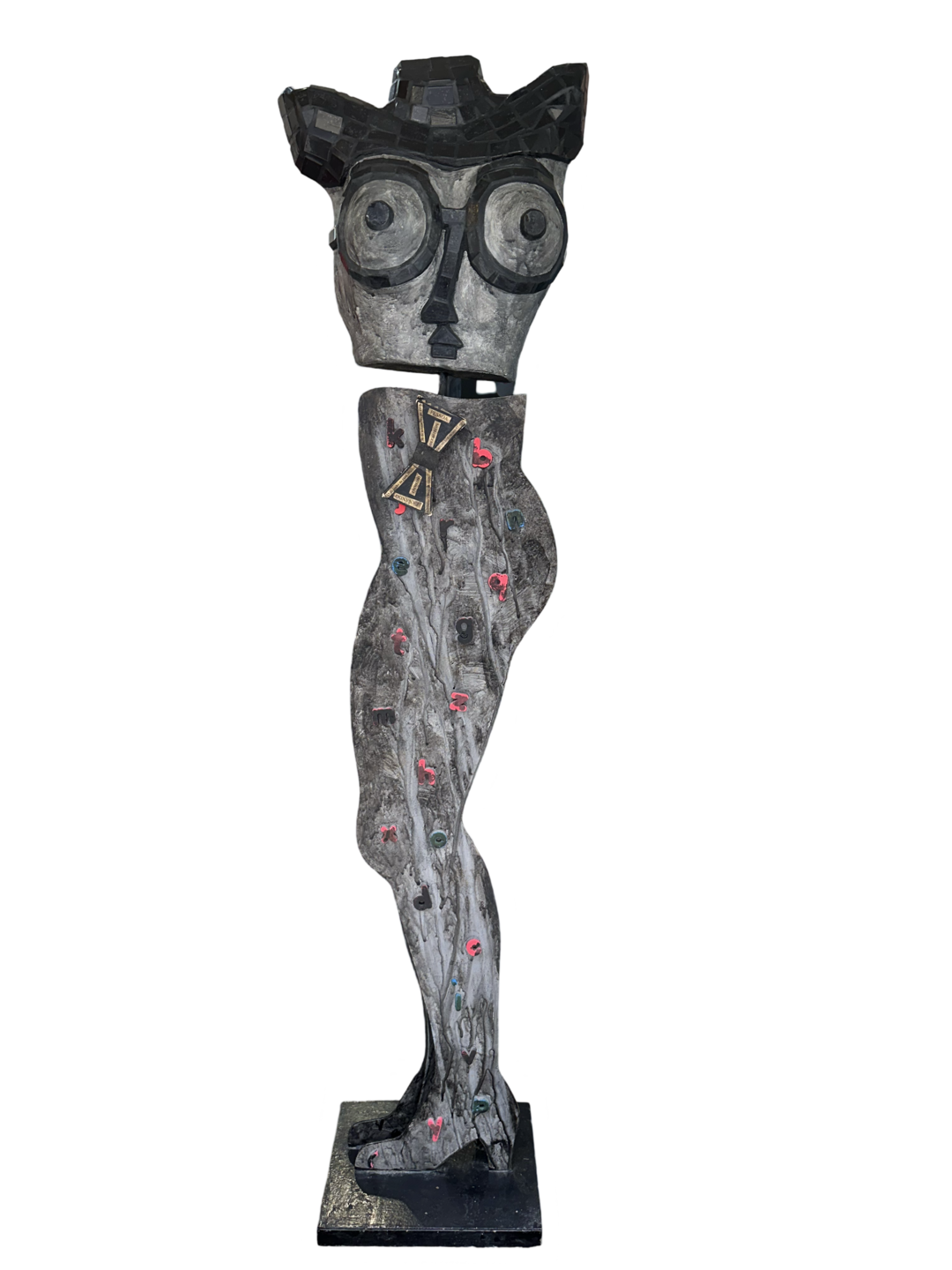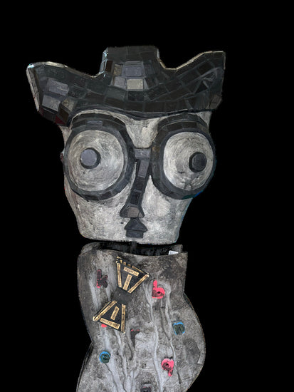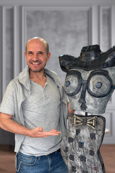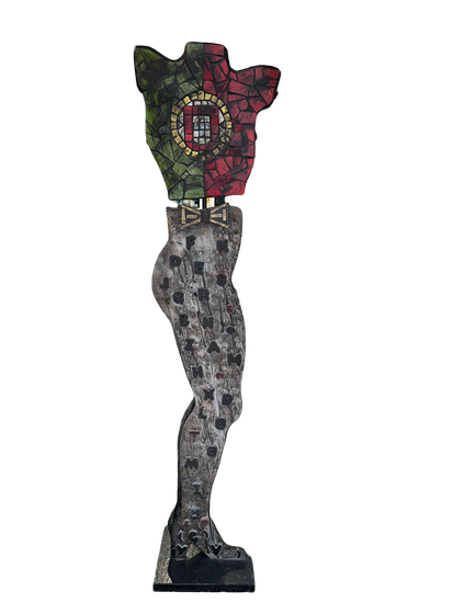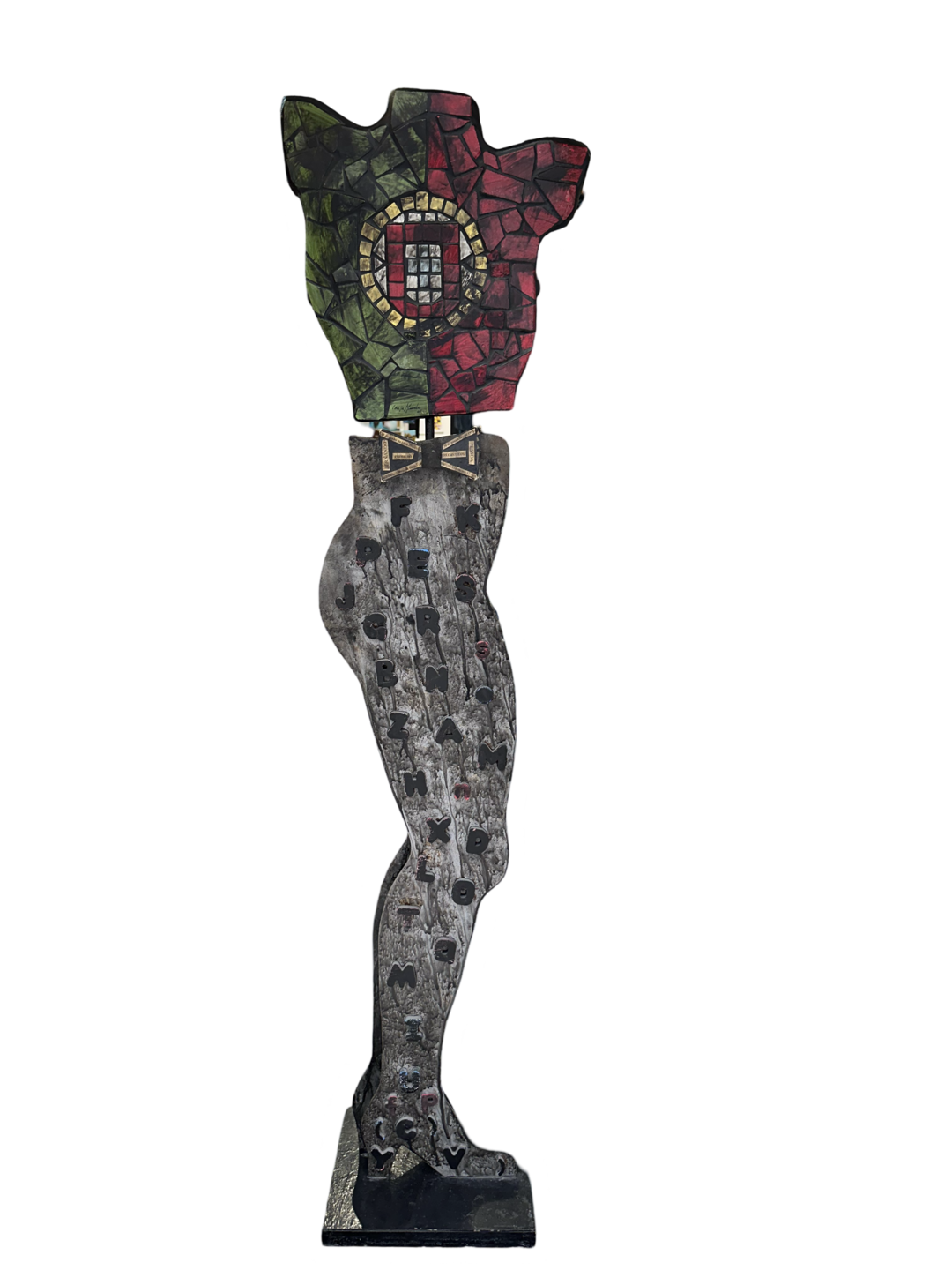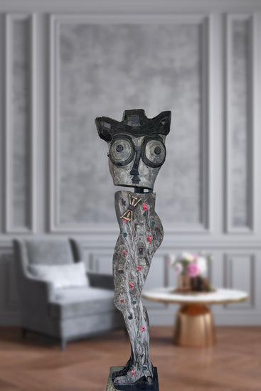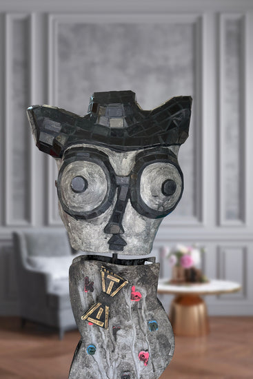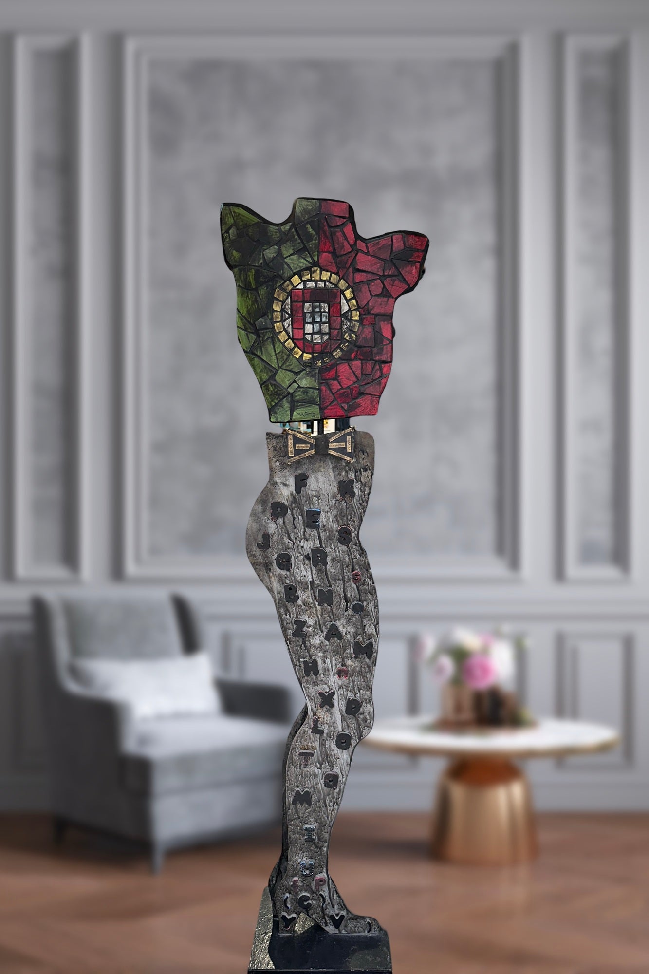 This avant-garde sculpture captures the essence of Fernando Pessoa, the iconic Portuguese writer, showcasing his multi-faceted personality. The rotating "head" symbolizes Pessoa's dynamic and fragmented identities, while the body is adorned with intricate details, including letters and symbols, representing his literary world and his relationship with Ophelia, his muse.