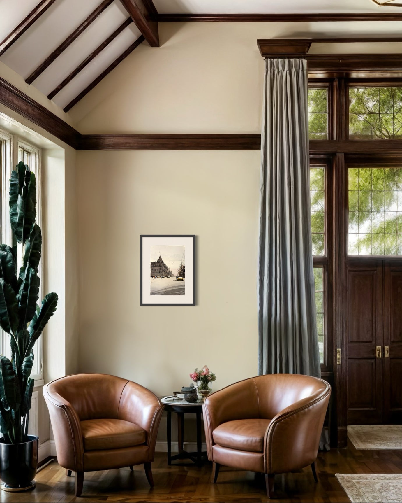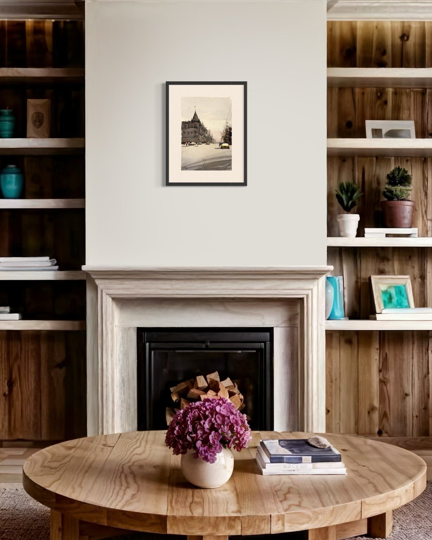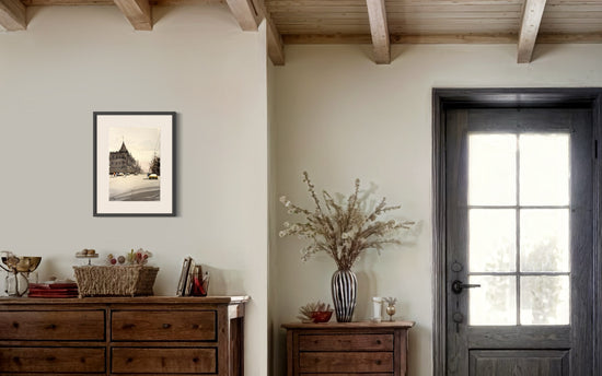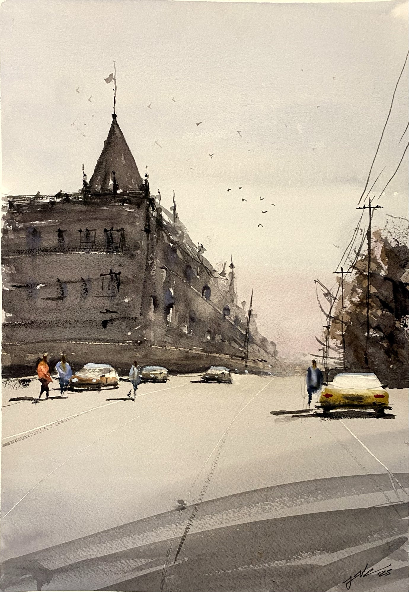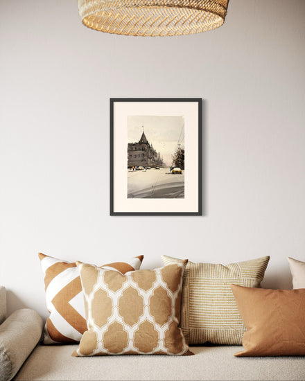 The gentle tones and soft shadows breathe a nostalgic calm into this fleeting city scene.