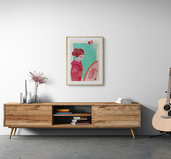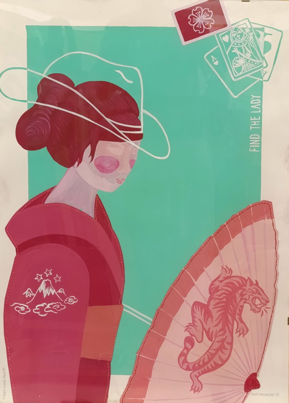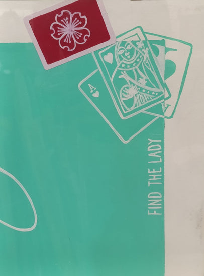 The playful addition of floating playing cards and a subtle hat outline adds a whimsical, contemporary twist. The bold color palette and minimalist design make this piece a striking addition to any space, celebrating the blend of cultural heritage and modern creativity with a fresh, eye-catching appeal.