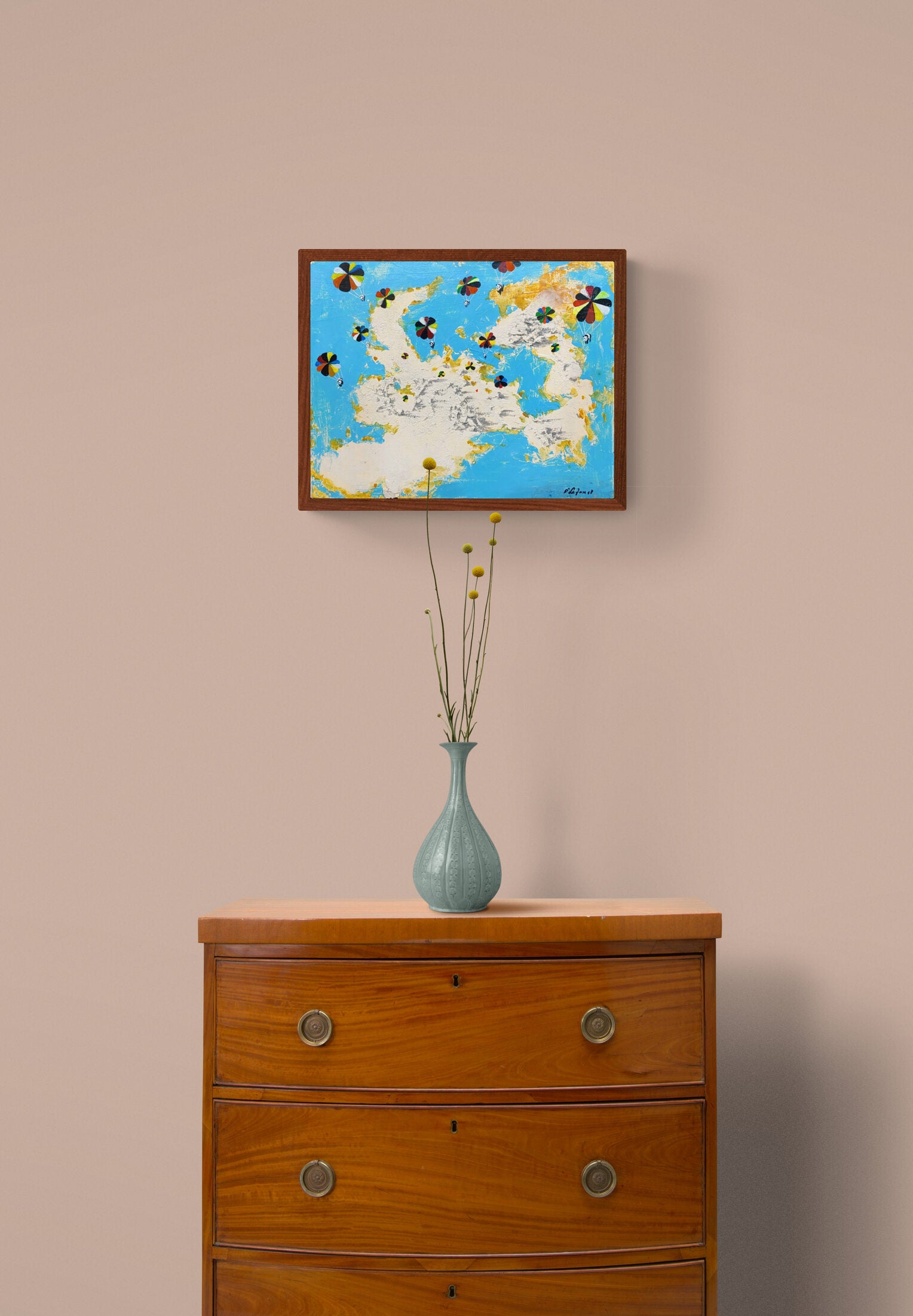 The world map, rendered in textured, pale hues, is set against a bright blue backdrop symbolizing the sky or sea. Parachutes in bold, multicolored patterns—each carrying a small, playful figure—float gently across the continents, evoking a sense of adventure and exploration. The rough, tactile surface of the continents contrasts with the smooth expanses of blue, creating an engaging interplay of texture and color. The playful figures and vibrant parachutes bring a sense of freedom and optimism, making this artwork an intriguing and delightful addition to any space.