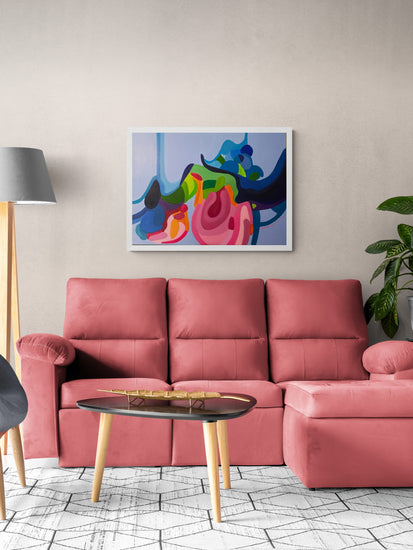 Rich greens, blues, and pinks dominate the canvas, creating a lively interplay of contrast and movement. The soft, curved shapes evoke natural forms, with deep blues suggesting water or sky, while the brighter pinks and oranges offer a grounding warmth. This piece invites viewers to interpret the organic energy flowing through the shapes, making it a work that stimulates personal reflection and emotional engagement.