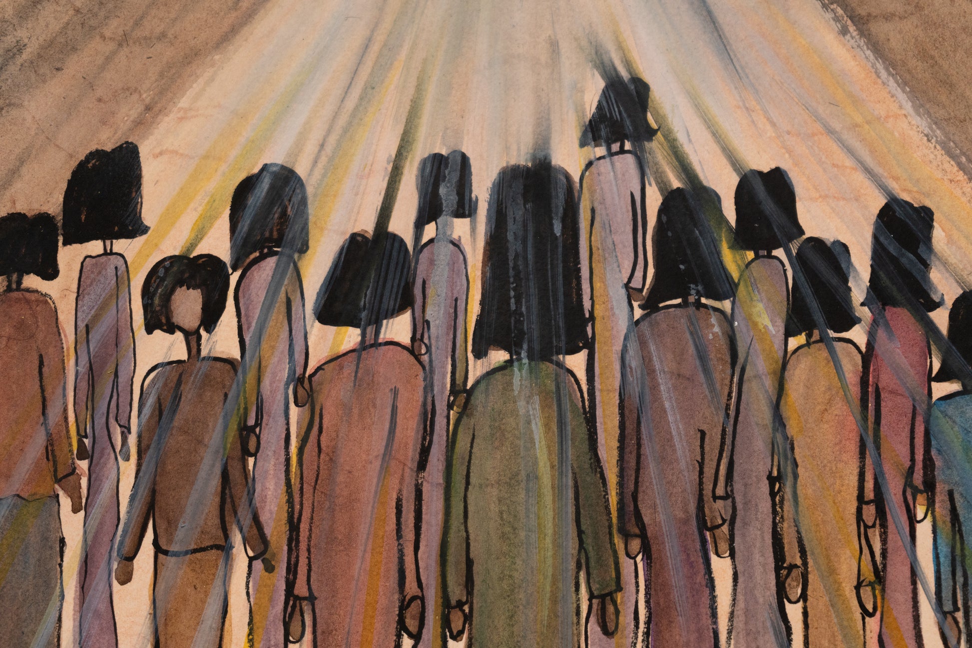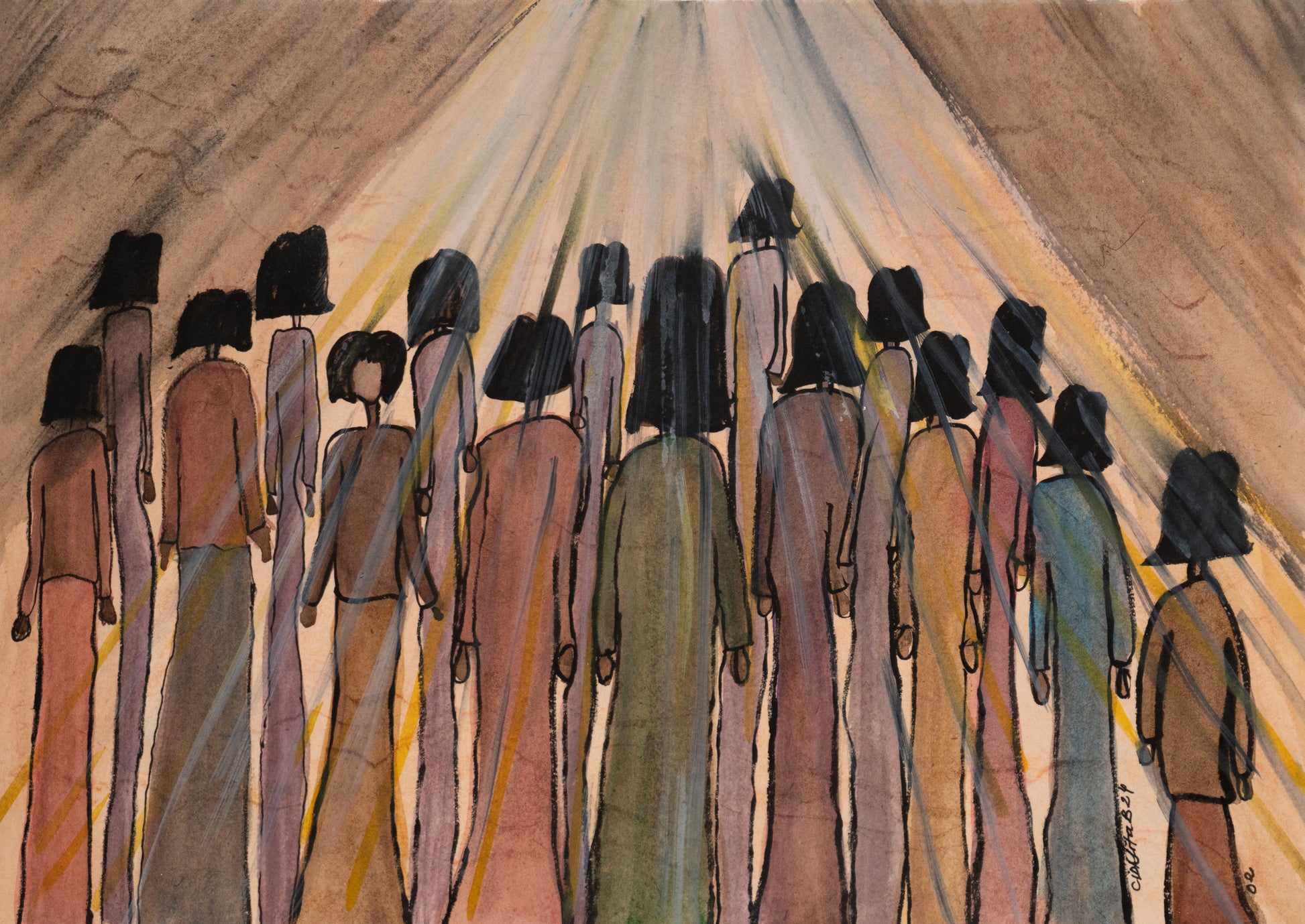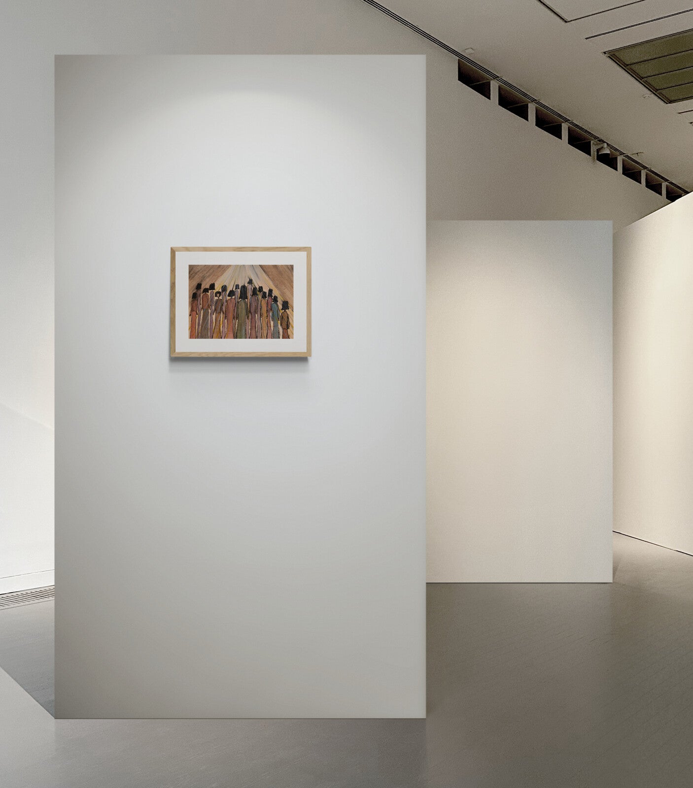 This painting captures a group of monks walking along a radiant path. The use of warm and cool colors in the background contrasts with the earthy tones of the monks’ robes, symbolizing a journey of enlightenment and spiritual pursuit.