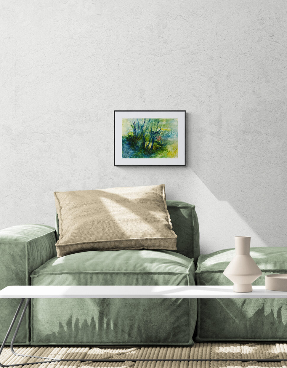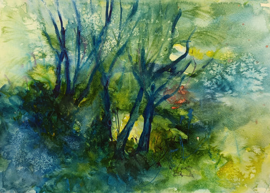 An ethereal watercolor painting that captures the mystique and beauty of a dense forest bathed in soft, diffused light. The blue and green hues blend seamlessly, creating a dreamlike quality where tree trunks seem to emerge from the mist. The layered textures and abstract forms evoke the feeling of being immersed in a tranquil forest, where the light filters through leaves, casting a calming glow over the scene. The fluidity of the brushstrokes adds to the sense of movement and depth, making the viewer feel as though they are wandering through a peaceful, enchanted woodland.