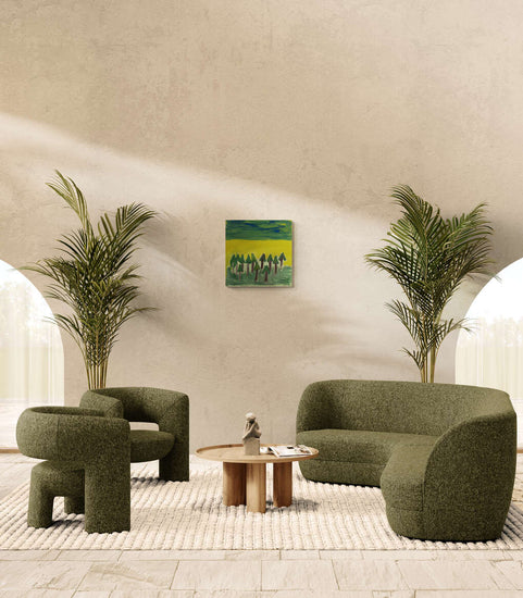 A vibrant landscape painting depicting the edge of a forest with stylized trees against a bright yellow field and a deep green sky. The use of bold colors and simplified forms creates a striking and energetic composition.