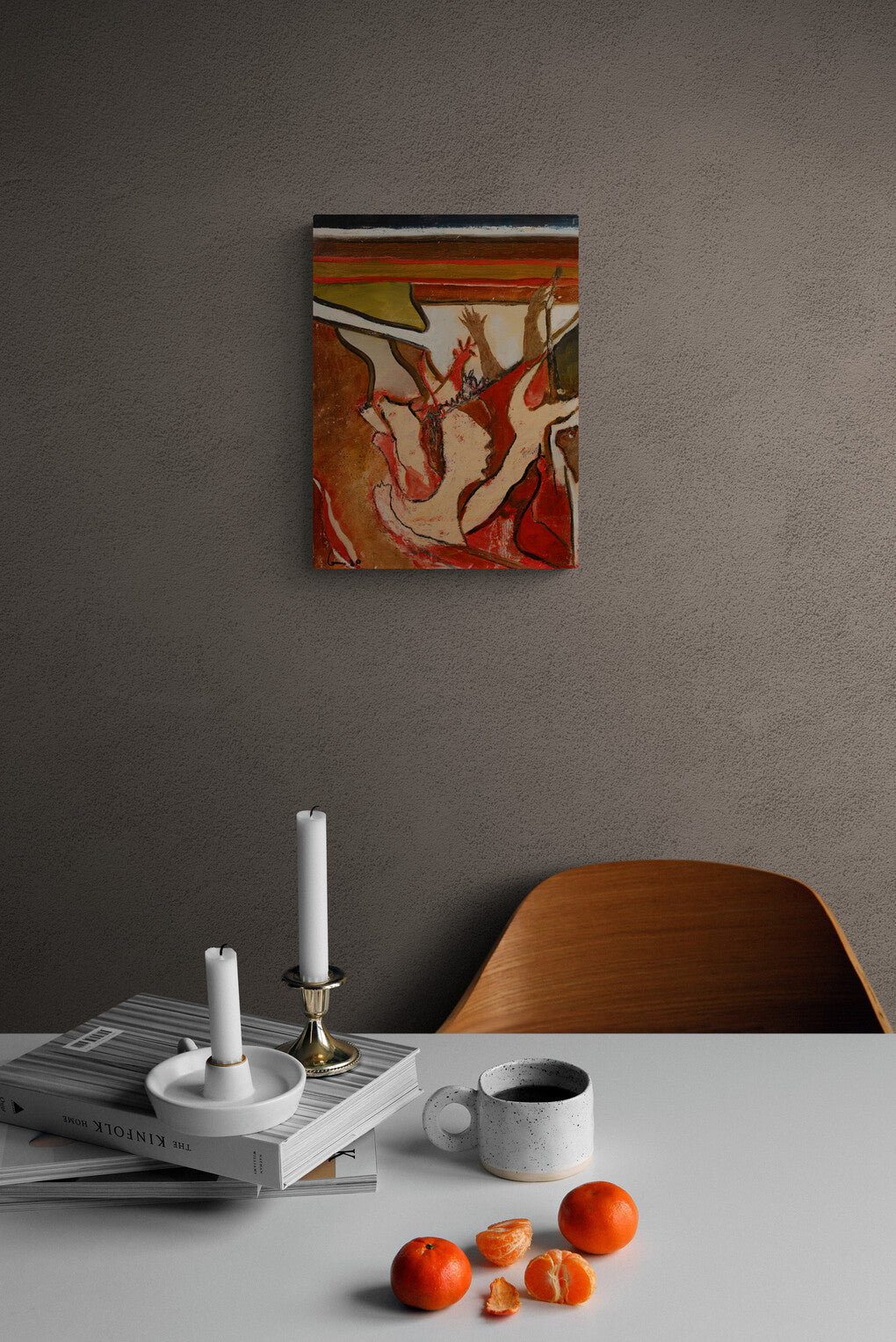 This abstract artwork explores the interplay of fragmented forms and contrasting colors. The composition features a series of intertwined shapes in red, beige, and brown, creating a sense of disjointed harmony. The use of bold outlines and textured surfaces adds depth and complexity to the piece, inviting viewers to delve into the layers of abstract expression.