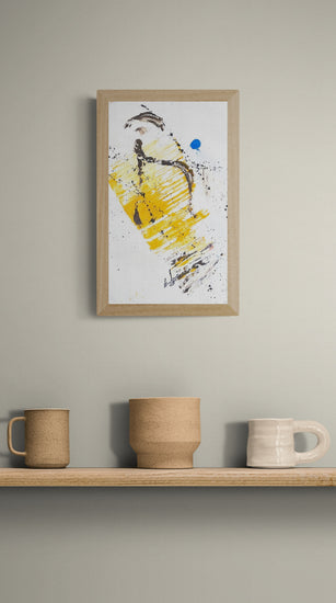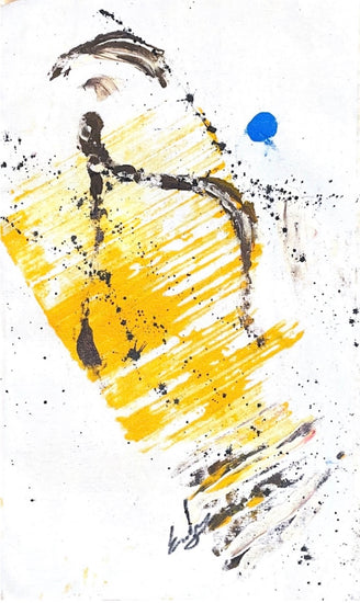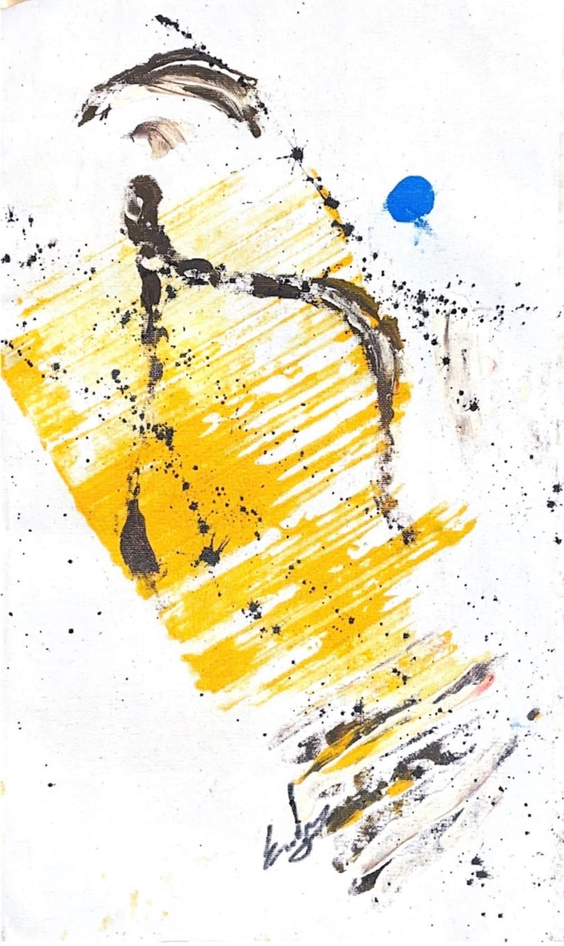 This abstract painting features bold strokes of yellow, white, and black, with splashes and speckles scattered across the canvas. The dynamic brushwork and contrasting colors evoke a sense of energy and motion, suggesting a fragmented, yet interconnected, stream of consciousness.