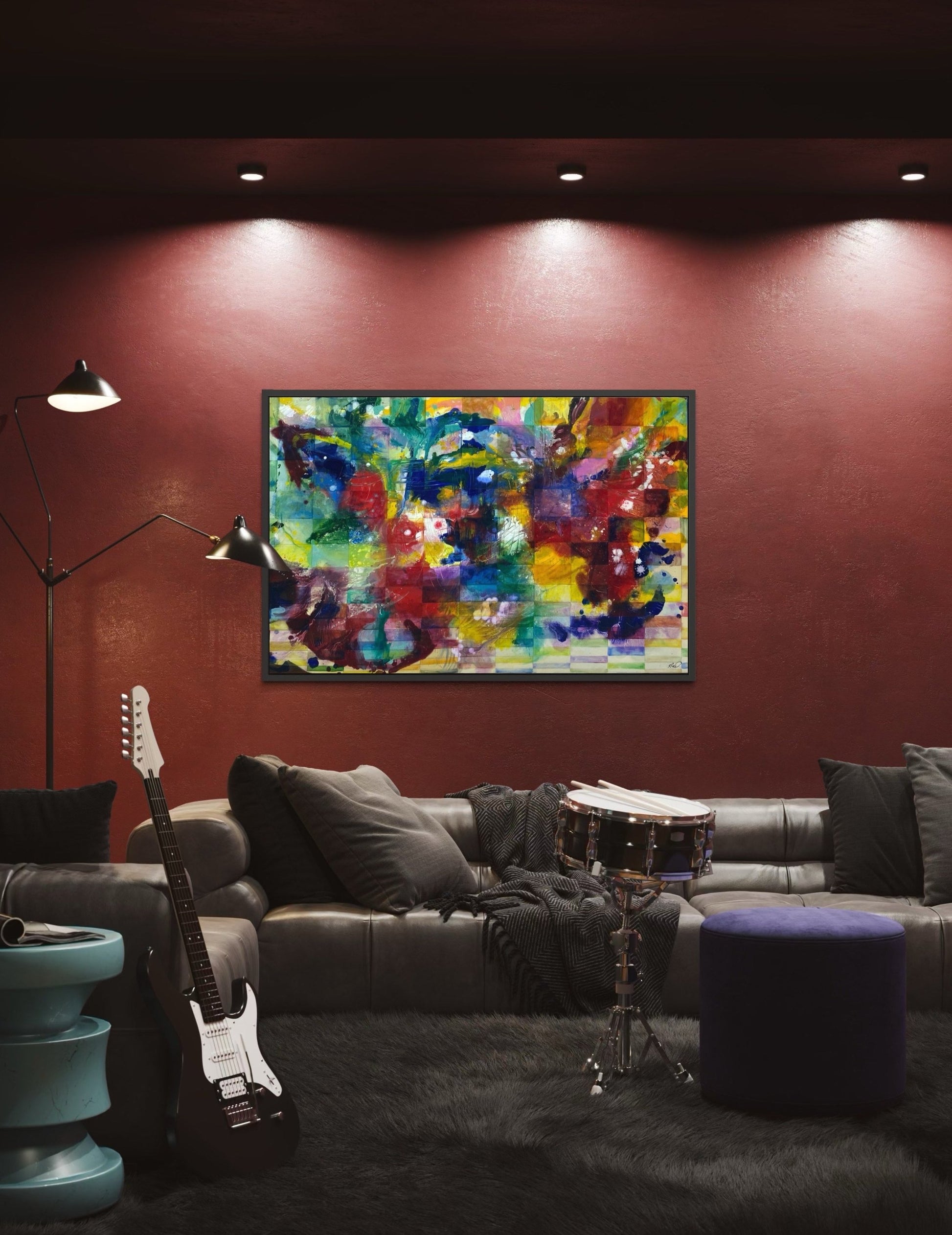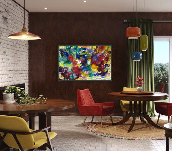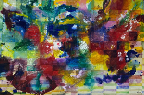 This piece bursts with color and energy, showcasing a mosaic of abstract forms and hues. The artwork is composed of numerous squares, each infused with expressive splashes and strokes, creating a sense of movement and layering. Bright reds, blues, greens, and yellows blend and contrast, evoking a chaotic yet harmonious rhythm across the canvas. This fragmented approach allows viewers to experience multiple perspectives within one piece, inviting them to explore its details and textures. "Fragmented Vibrance" captures the essence of spontaneity, with each square contributing to an overall symphony of color.