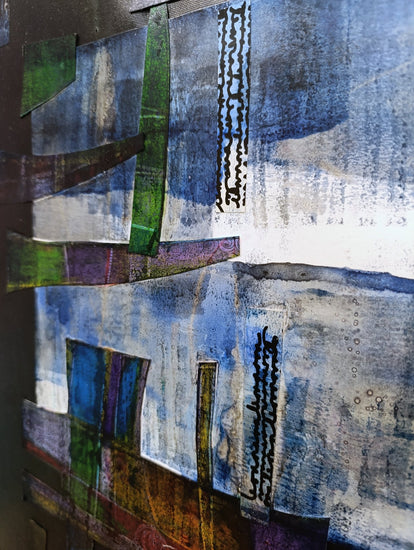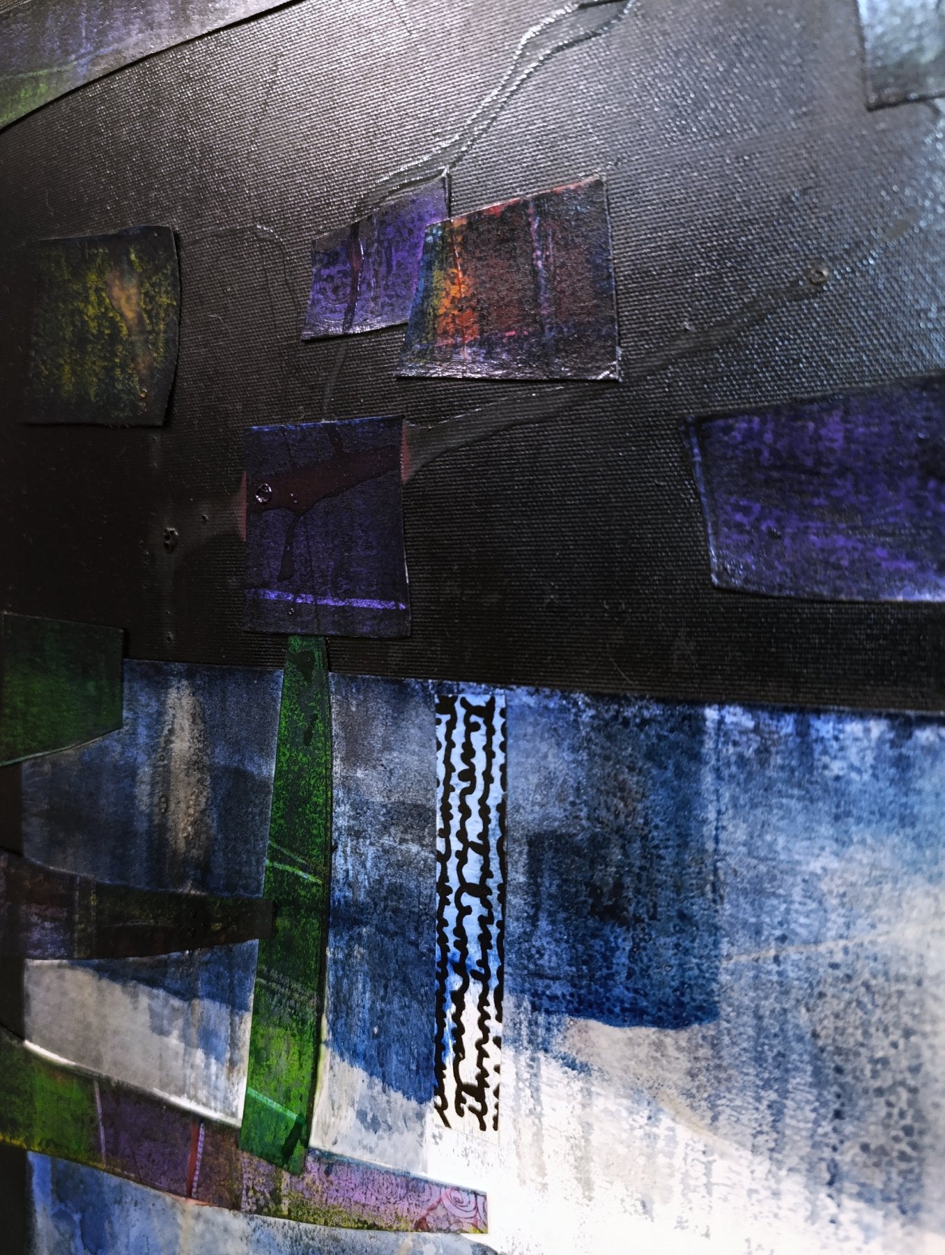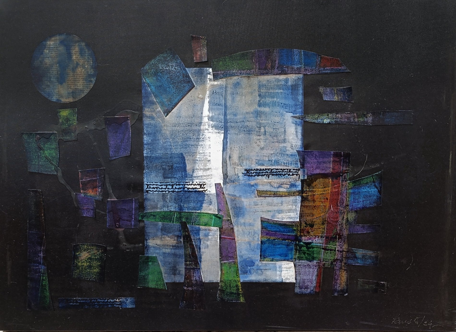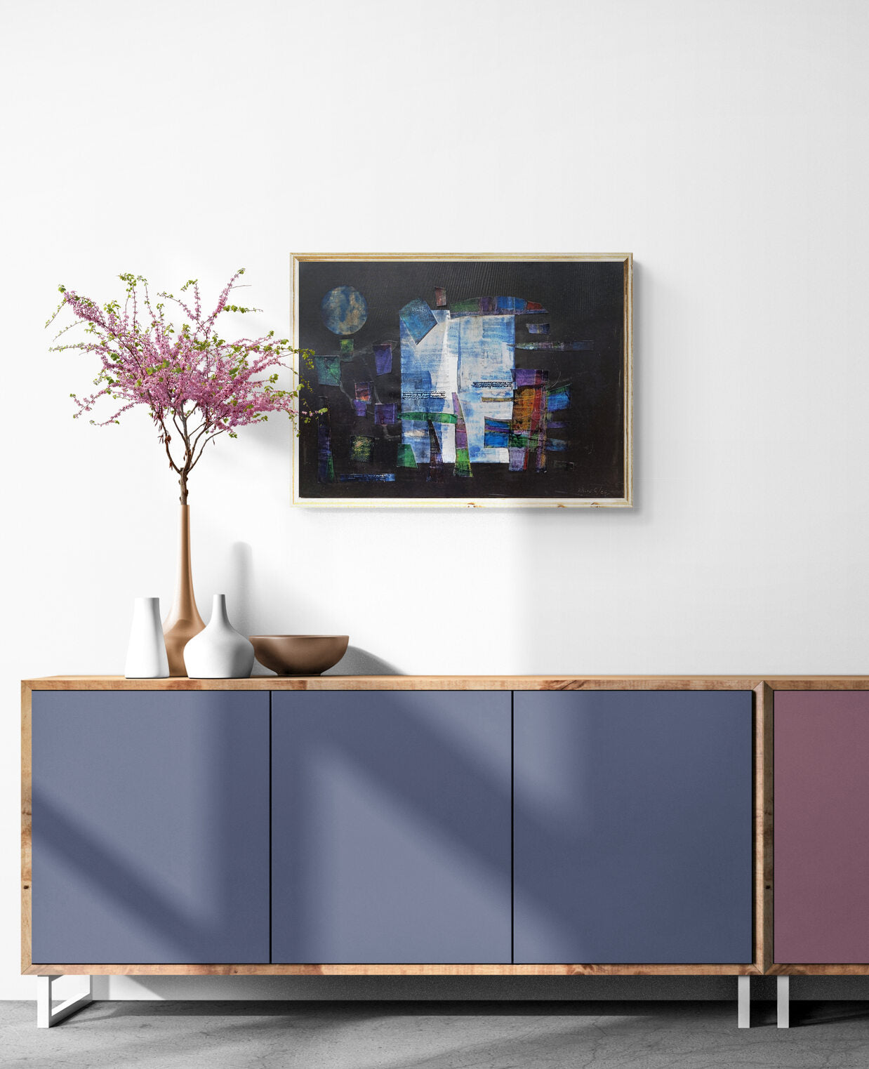 A captivating abstract composition that explores the interplay of shape, color, and texture against a dark, enigmatic background. The painting features a collection of geometric forms in deep blues, purples, greens, and hints of warm tones, layered over a central structure that glows in soft shades of silver and blue, as if illuminated by moonlight. The pieces appear fragmented yet interconnected, creating a sense of depth and movement, as if each element is drifting within the night sky. A round, celestial form in the upper left suggests the moon, casting its subtle glow over the abstract landscape. The textured surfaces and varying opacities invite viewers to interpret the shapes as fragments of memories or dreams, floating in a vast, quiet expanse.