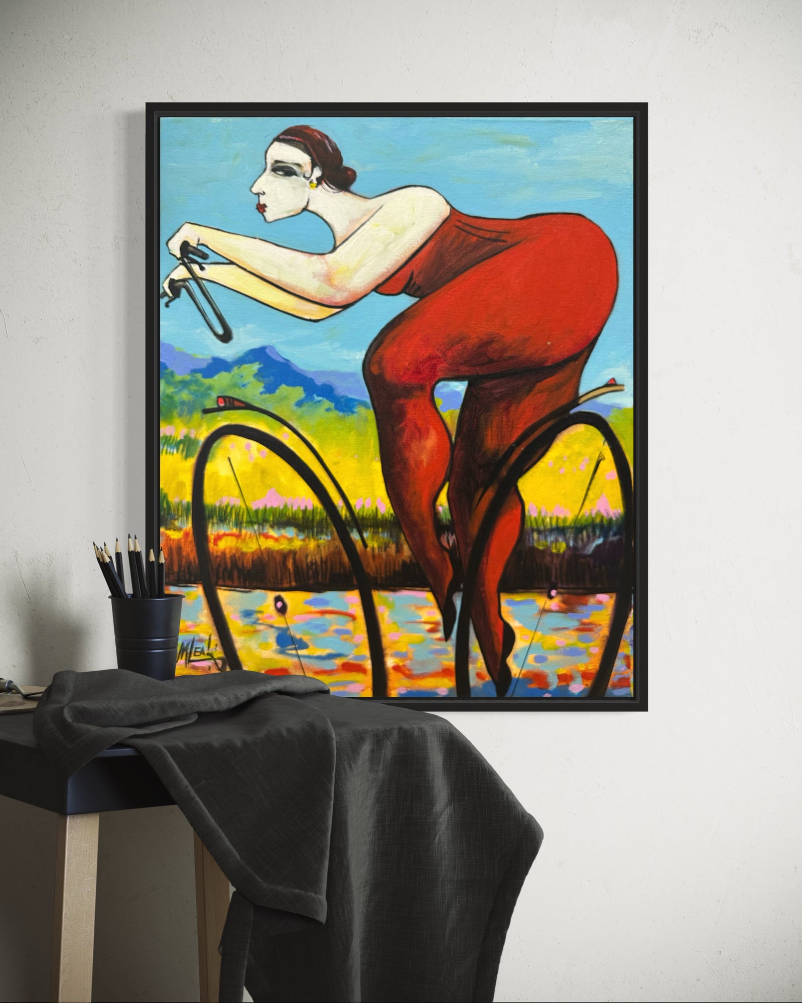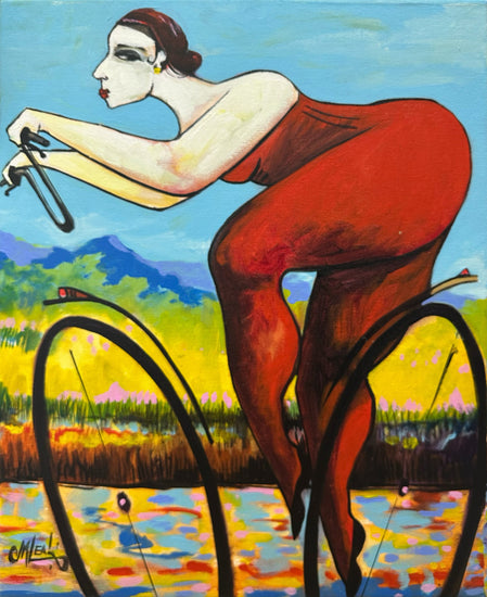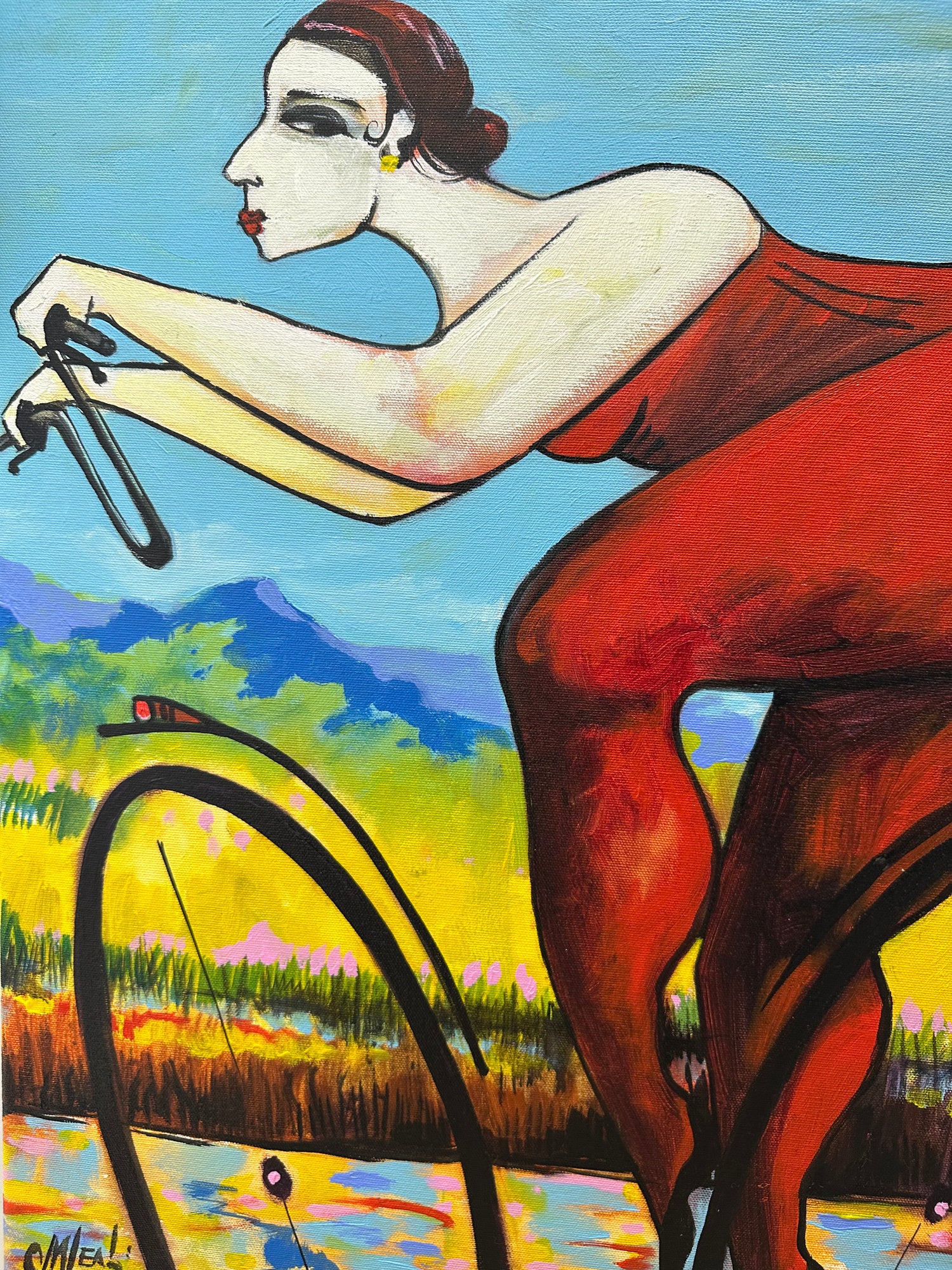 A dynamic expressionistic portrayal of a woman cycling through a vibrant natural landscape, emphasizing sweeping curves, bold colors, and a sense of liberated movement.