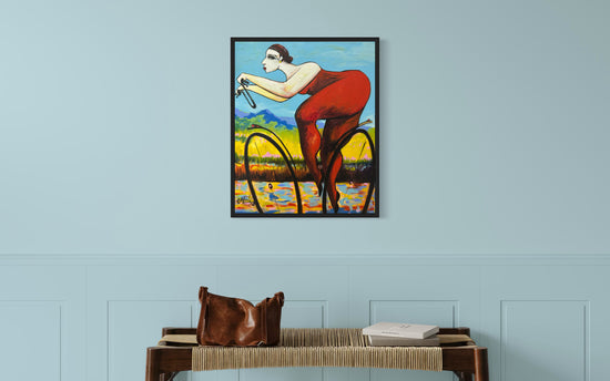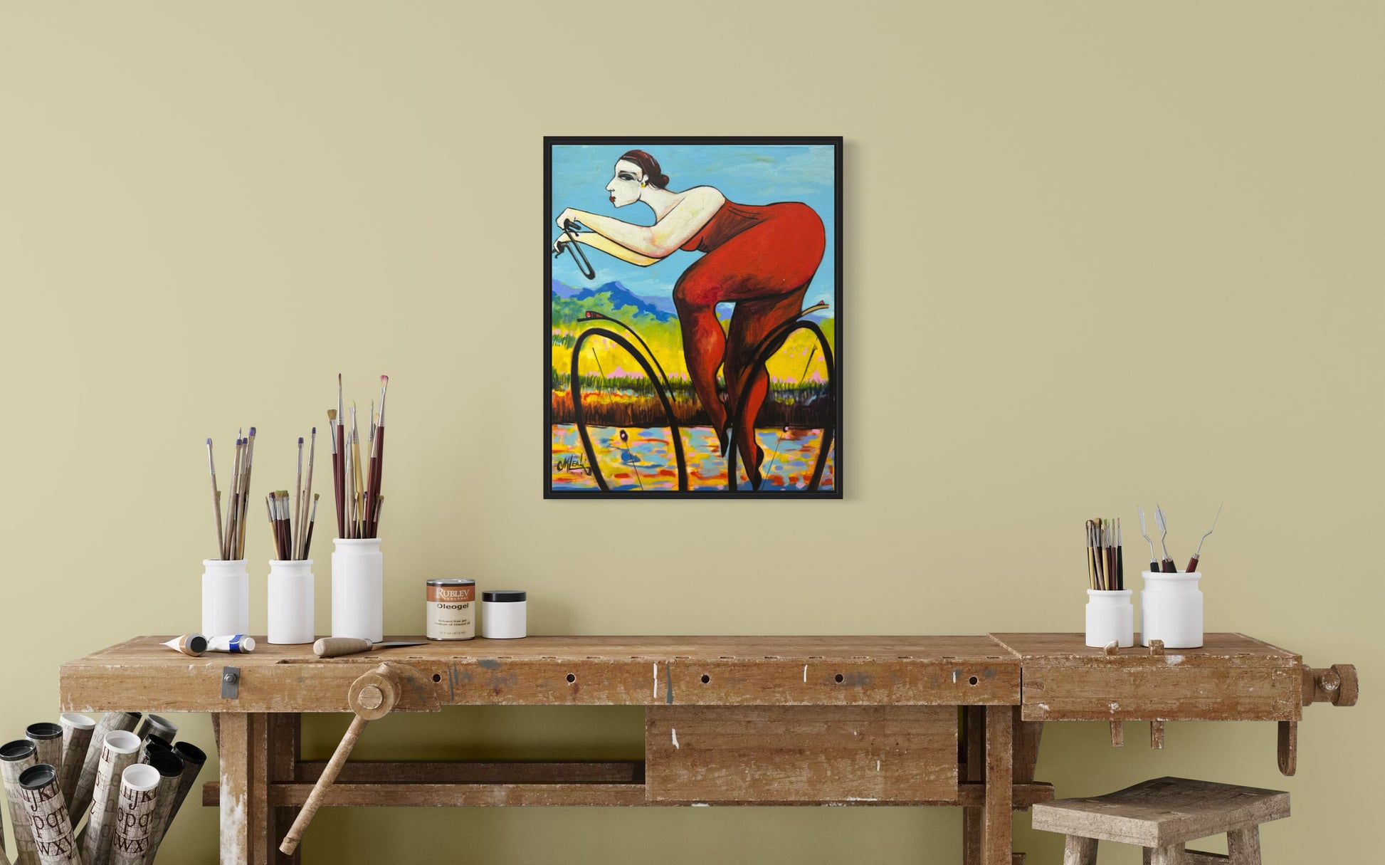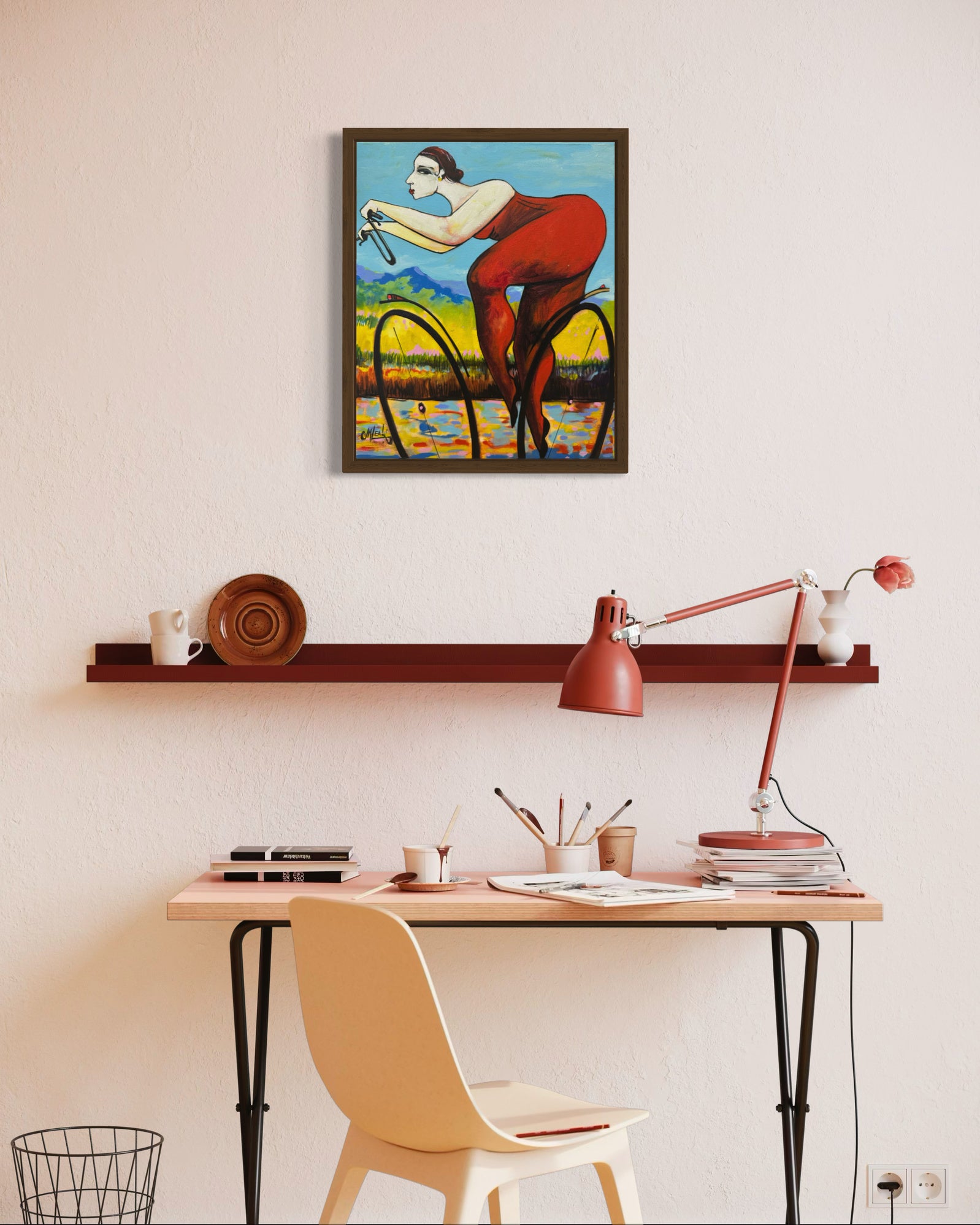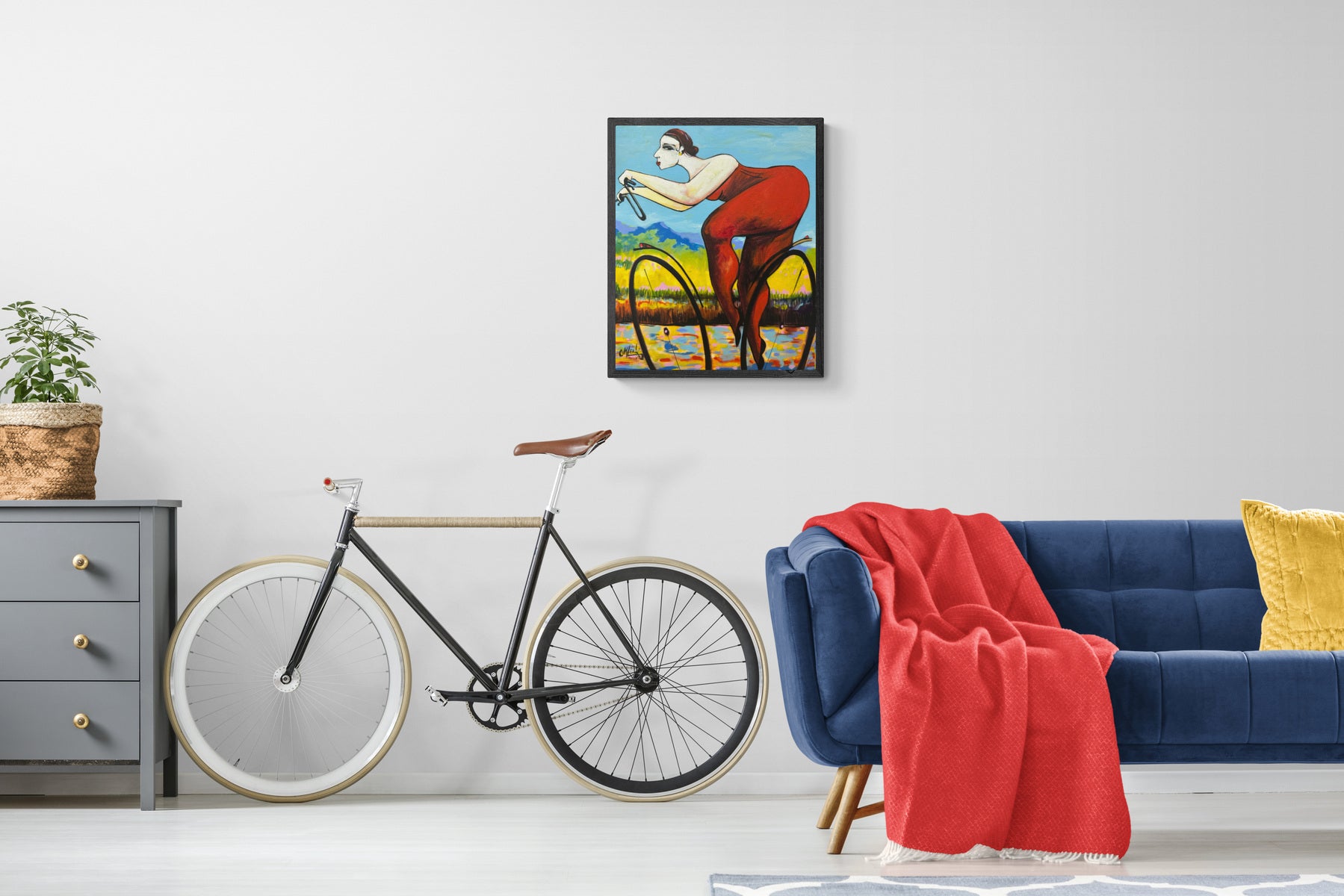 A dynamic expressionistic portrayal of a woman cycling through a vibrant natural landscape, emphasizing sweeping curves, bold colors, and a sense of liberated movement.