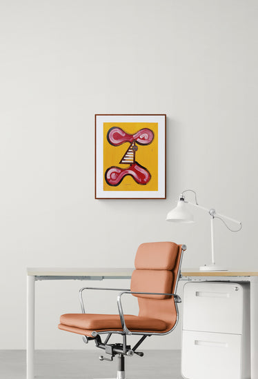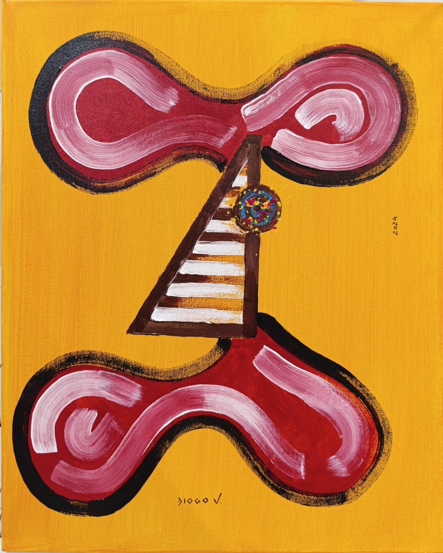 This energetic and playful abstract painting that draws the viewer's attention with its bold shapes and vivid colors. Set against a rich yellow background, the painting features two curving red forms that balance on either side of a central triangular structure, resembling a staircase or path. At the center of this dynamic composition is a multicolored circular element, adding an extra layer of complexity and visual interest. The swirling brushstrokes and rhythmic movement within the forms create a sense of flow and exploration, inviting the viewer to interpret the narrative behind the geometric and organic shapes.