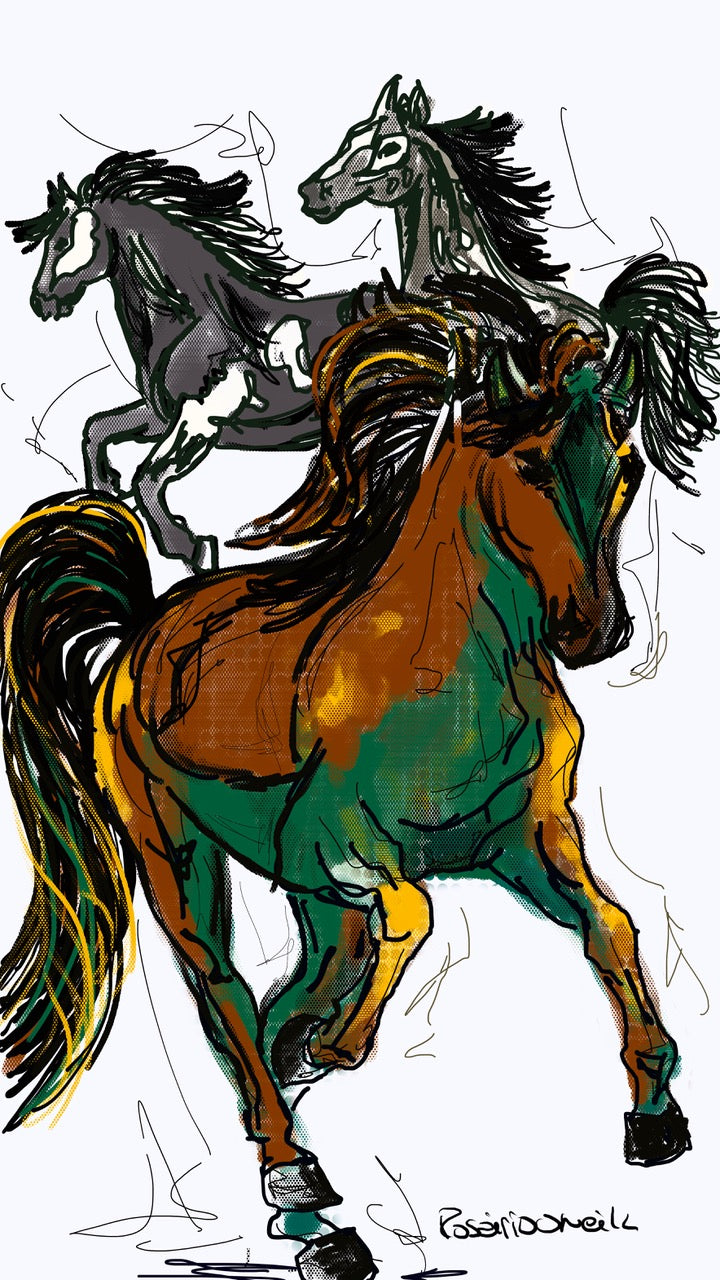 The central horse, rendered in earthy tones of green and brown, stands out as the focus, with its powerful musculature and flowing mane. Two other horses, depicted in grey and black, add depth and movement to the composition. The rough, sketch-like quality of the lines gives the artwork a sense of spontaneity and freedom, evoking the untamed spirit of the animals. The minimal background ensures that the focus remains on the horses' dynamic forms as they gallop across the canvas, full of energy and life.