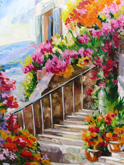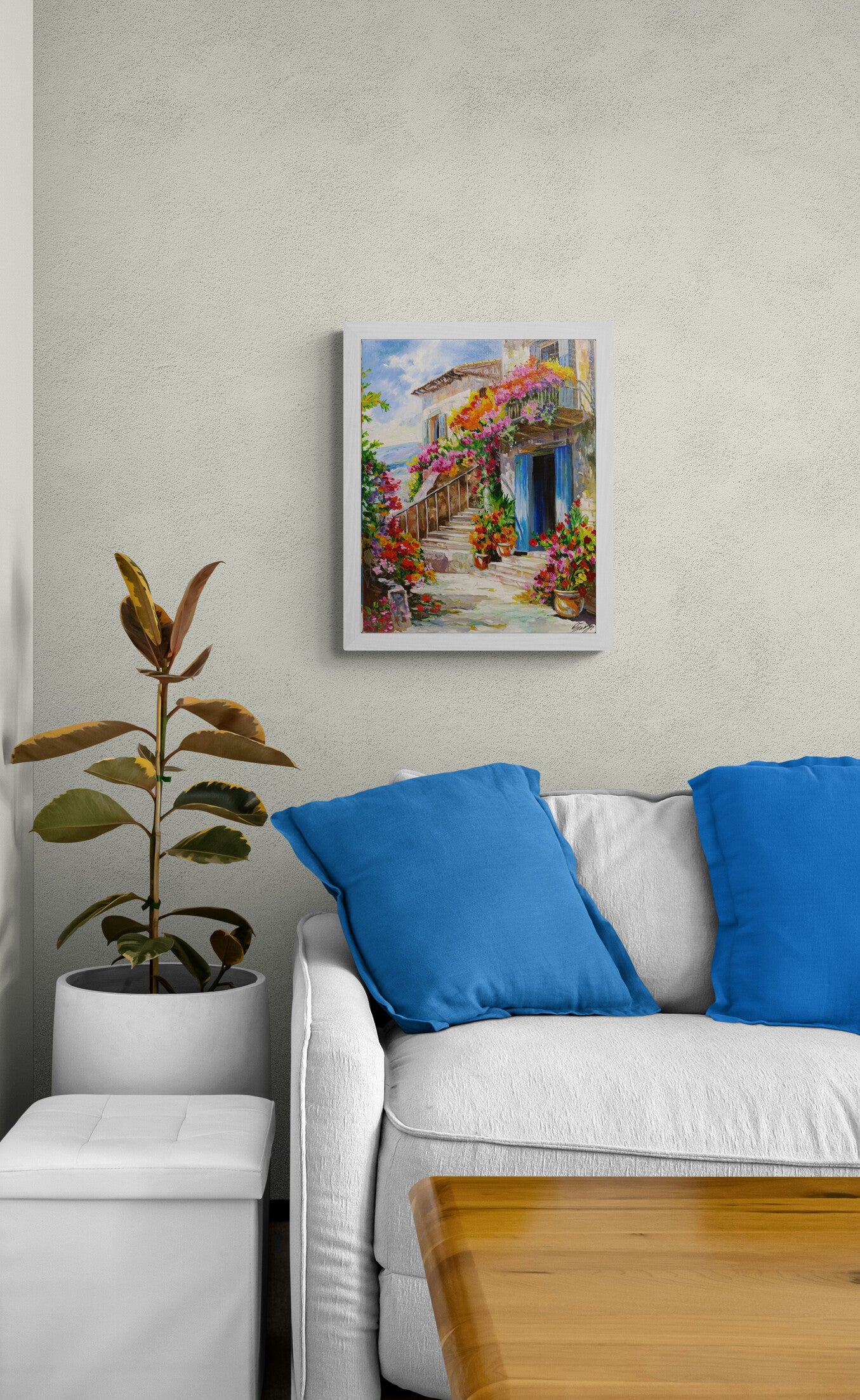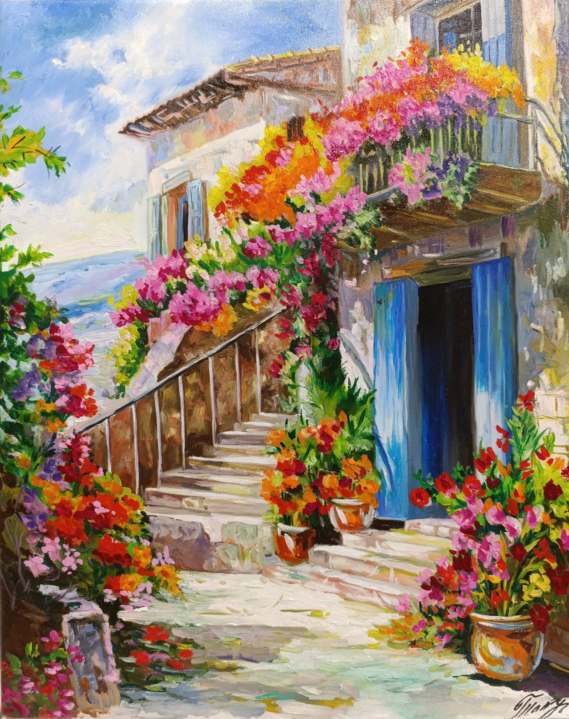 The painting invites the viewer to step into a serene world where cascading flowers in shades of pink, red, and orange overflow from balconies and terracotta pots, framing a quaint stone staircase that leads to a charming blue doorway. The scene is bathed in soft, natural light, which enhances the rich textures and vivid colors of the flowers, evoking a sense of warmth and nostalgia. The artist’s brushstrokes bring a lively yet soothing energy to the composition, celebrating the simple pleasures of life in a picturesque setting.