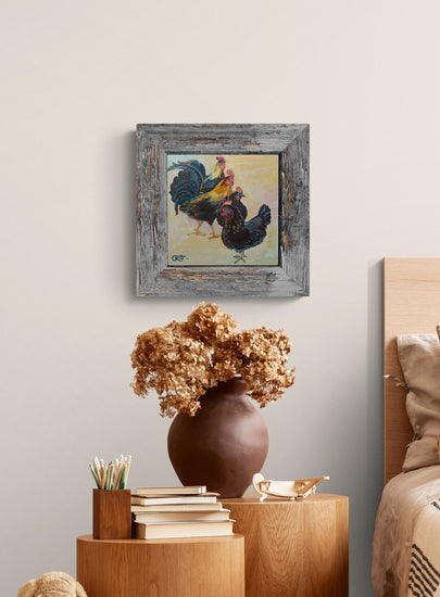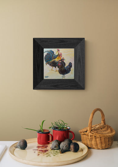 The painting skillfully captures the essence of these remarkable birds with expressive brushstrokes and a vibrant color palette, highlighting their unique personalities and intricate plumage. The artist's use of light adds depth and dimension, drawing the viewer into the scene and creating a compelling connection with the subjects.