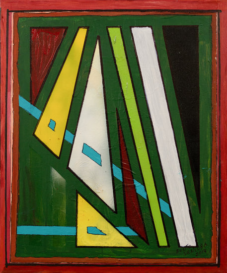 This painting features a dynamic arrangement of geometric shapes and lines, primarily in shades of teal, white, black, and green, set against a textured background. The composition is framed by a red border that adds a sense of containment to the chaotic interplay within. Diagonal lines intersect with vertical and horizontal elements, creating a sense of movement and tension. Swirls of white paint and splashes of green and red add depth and complexity, suggesting a blend of control and spontaneity. The contrast between the sharp lines and the organic shapes creates a visually stimulating and thought-provoking piece.