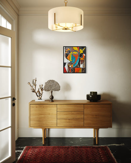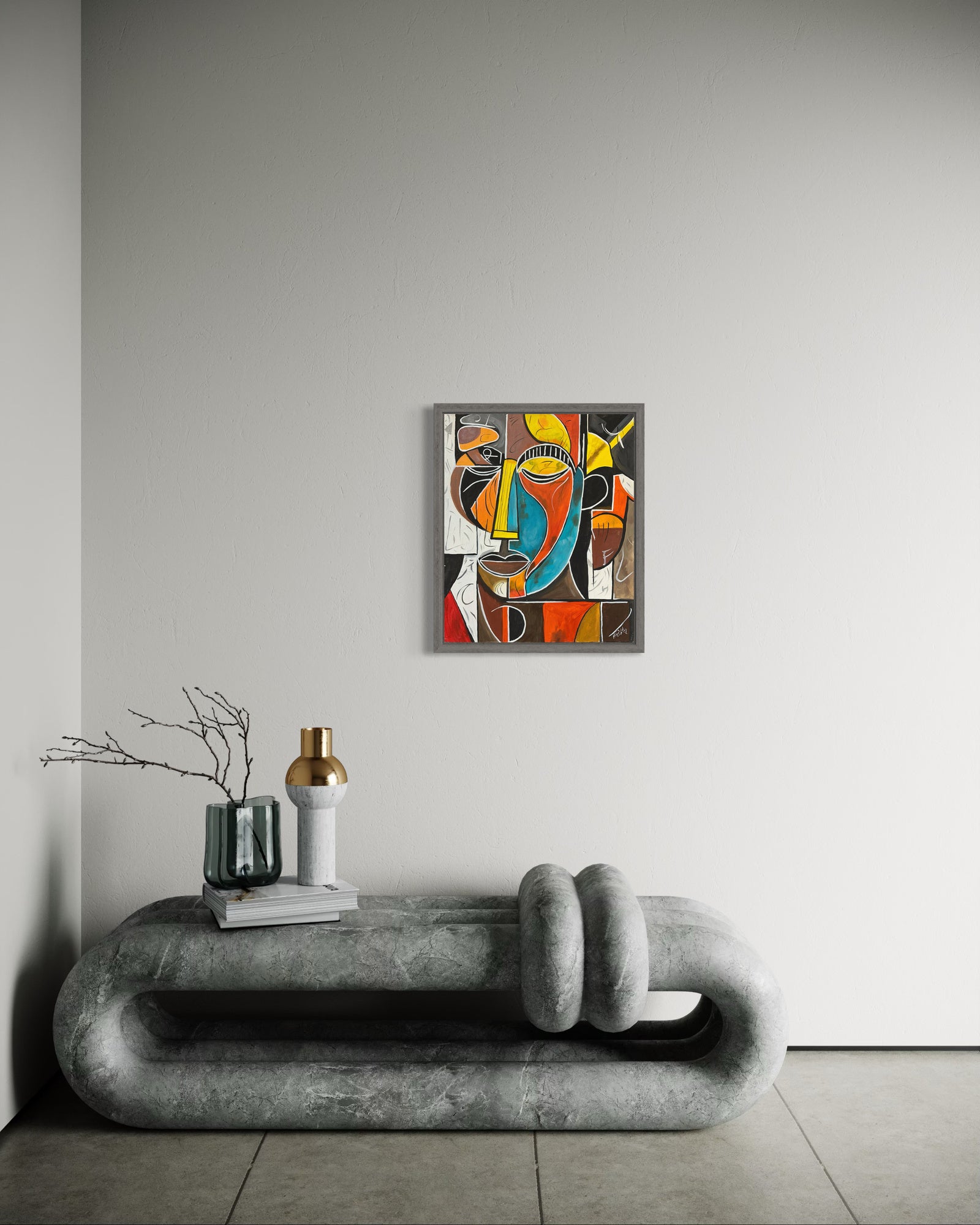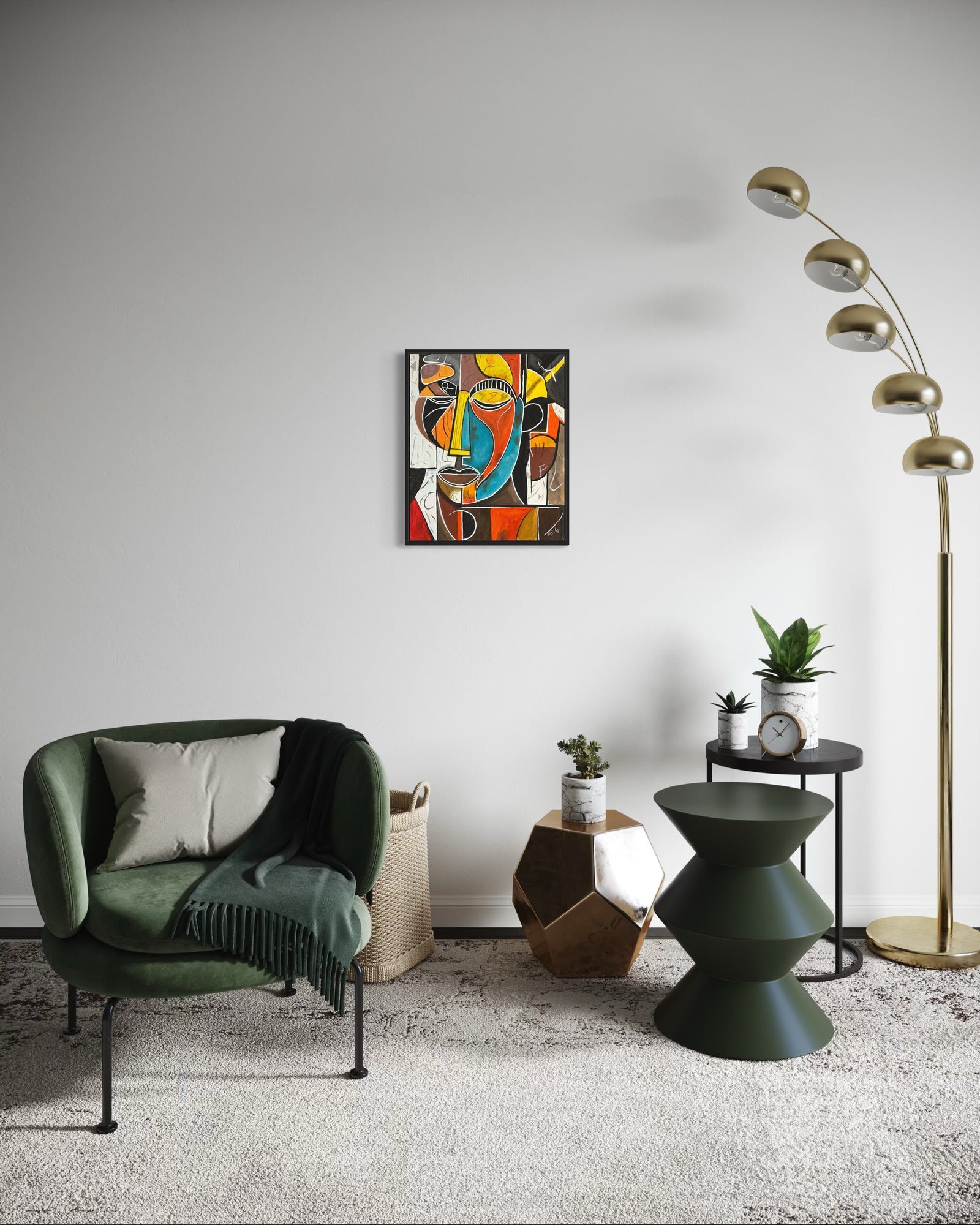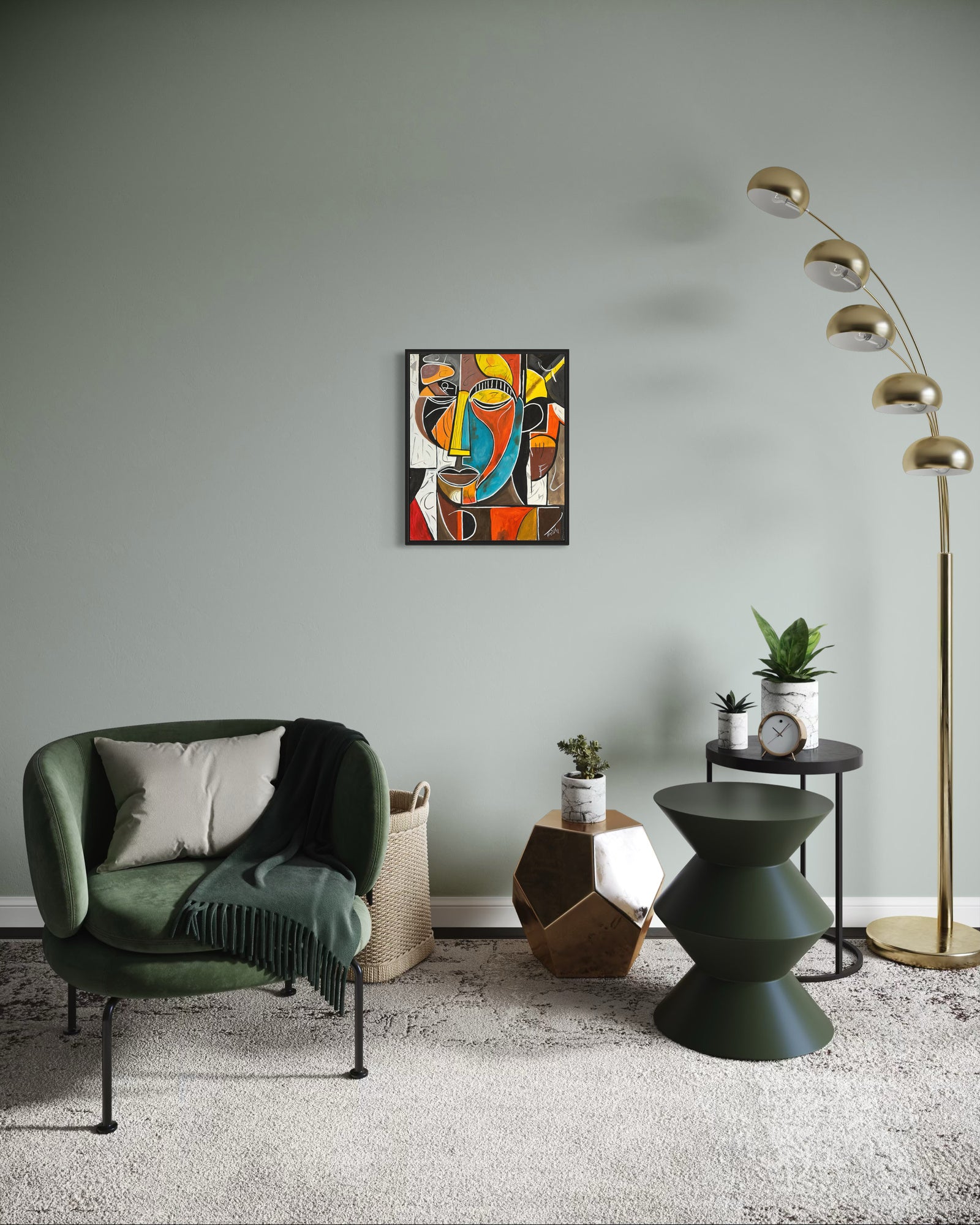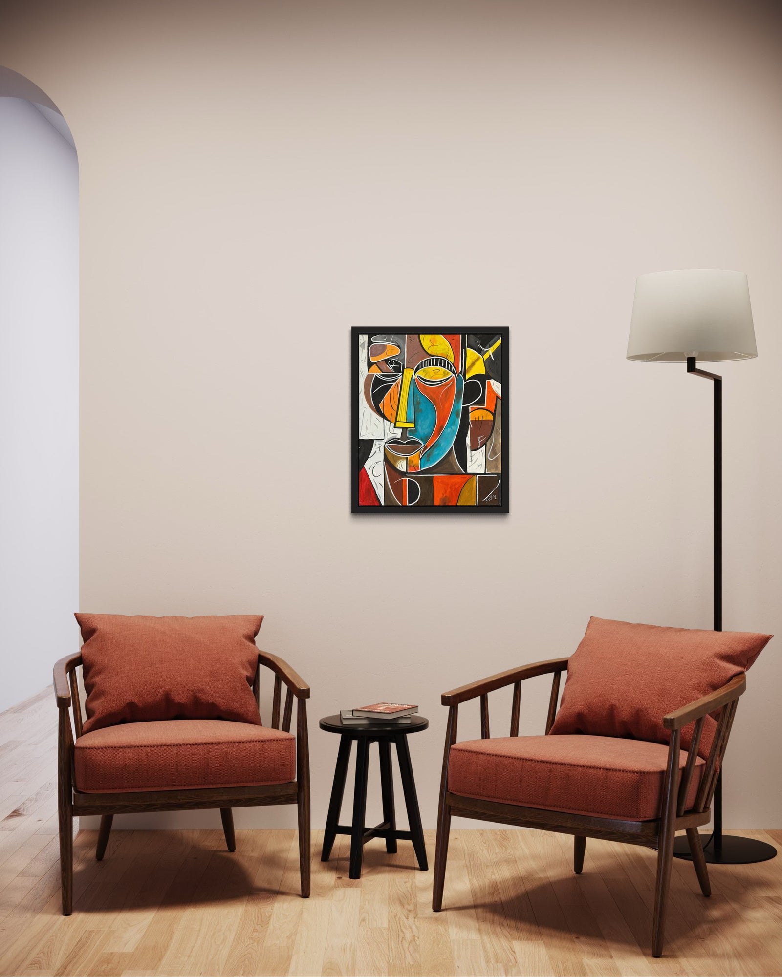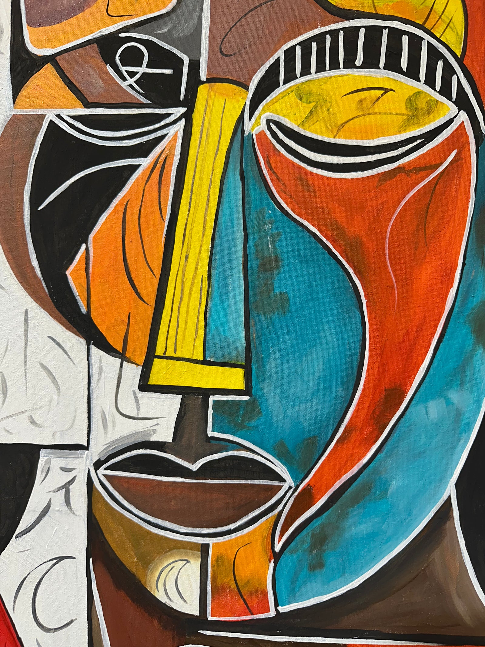 An abstract cubist portrait composed of bold planes of color and fragmented facial features, conveying a vibrant, modern energy.