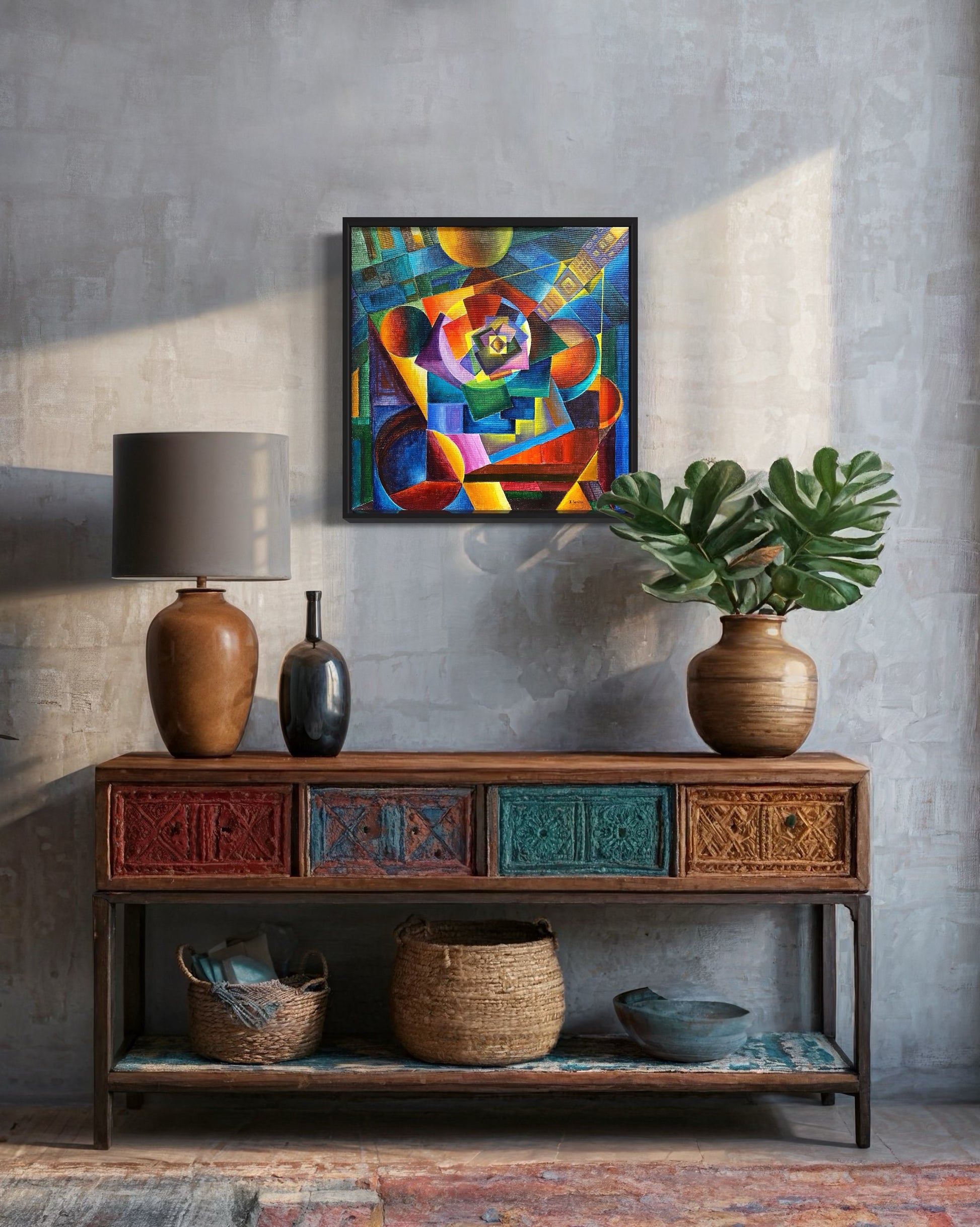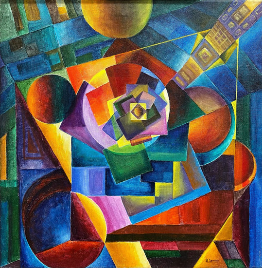 An abstract exploration of shapes and colors, woven together in a complex yet cohesive composition. The vibrant palette of blues, greens, yellows, and reds creates a visually dynamic piece that feels both energetic and balanced. At the center, a multi-layered form draws the eye, hinting at the concept of inner focus amidst chaos. Each geometric shape seems to interact, overlap, and dance, creating a symphony of form and color that invites the viewer to explore the intricate layers and connections within. This piece resonates with an abstract sense of order and beauty within complexity.