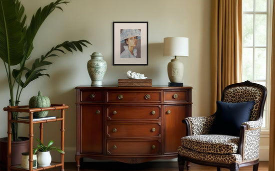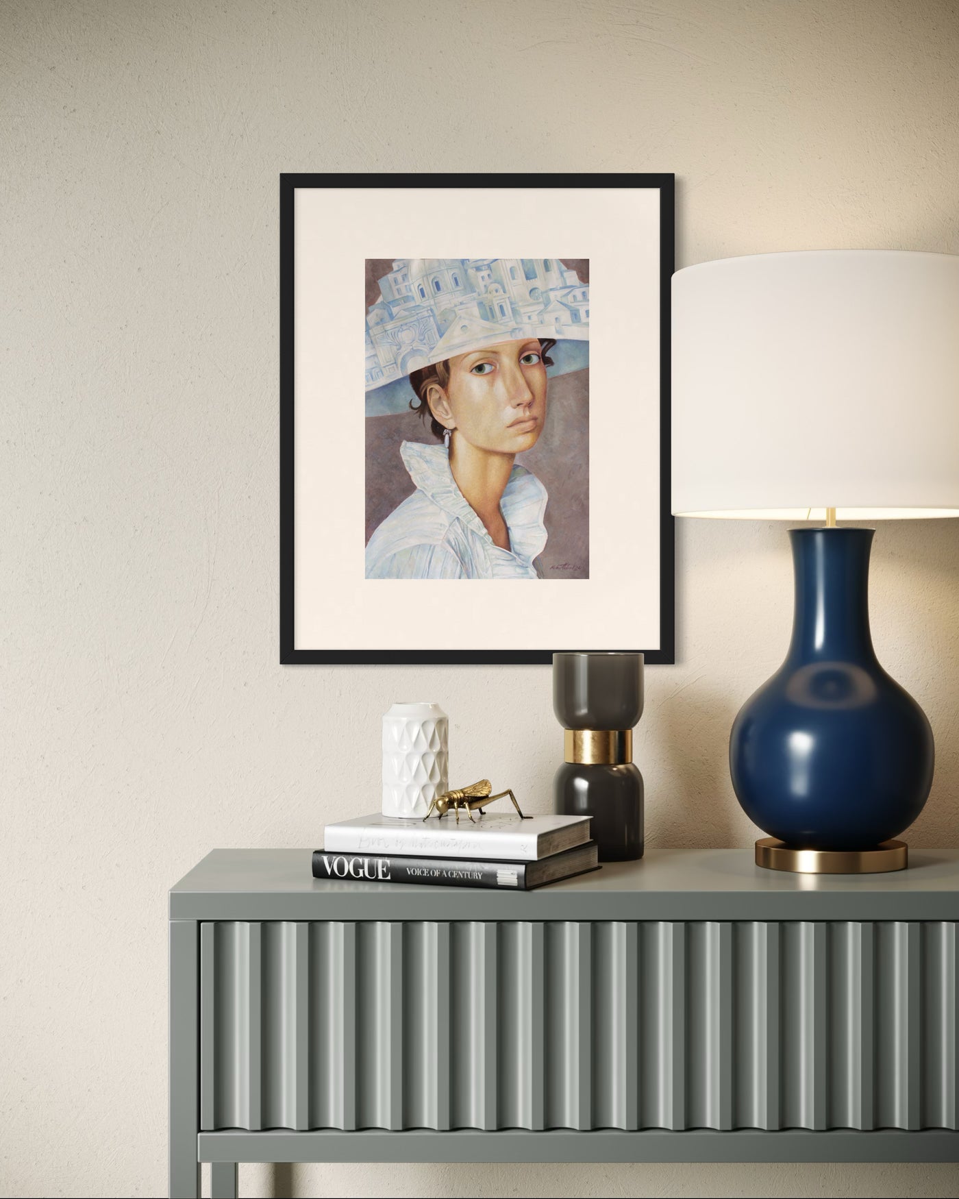 A contemplative portrait where a serene-faced woman wears a cityscape as a hat, merging classical realism with a surreal flourish.