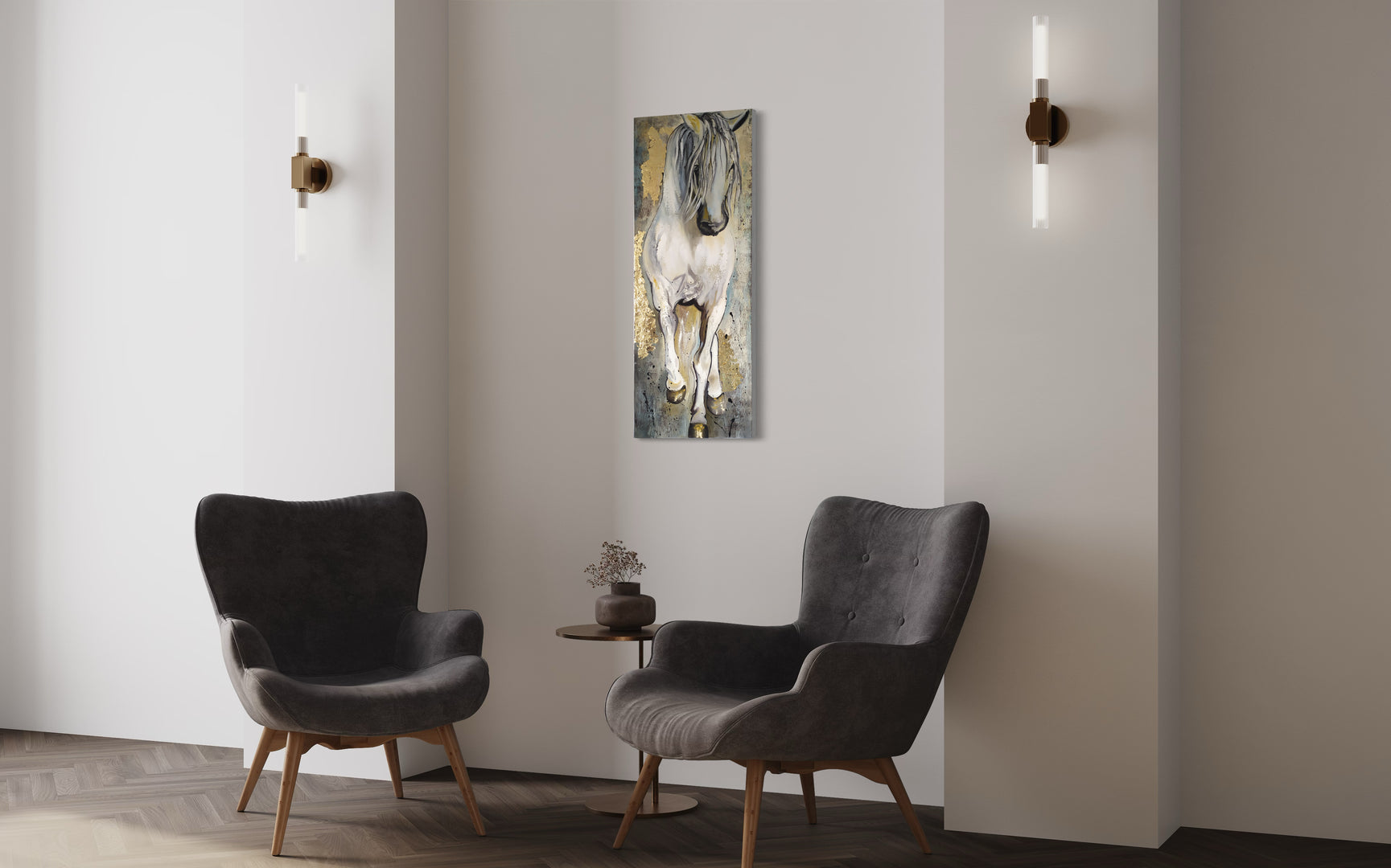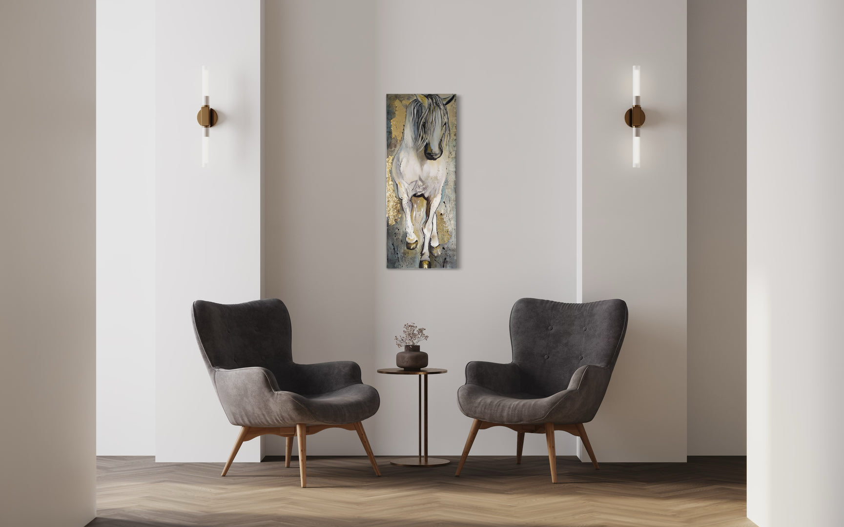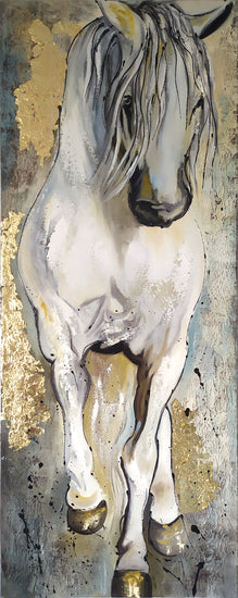 The horse is rendered with textured strokes of white and gray, accented with gold leaf that highlights its mane and hooves, adding a regal touch to the composition.