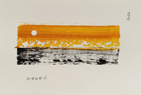 This painting radiates warmth and energy through the use of bold yellow and orange hues. The layered horizontal strokes create a vibrant sky, with splashes of white representing the light and movement of a sunset or sunrise. Below, the black and white base adds depth and contrast, grounding the bright upper section while still allowing a sense of fluidity. The simplicity of the composition, combined with textured brushstrokes, evokes a feeling of calm yet powerful natural beauty. This minimalist piece captures the fleeting beauty of a golden moment in time.