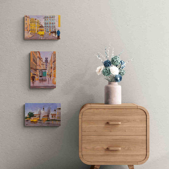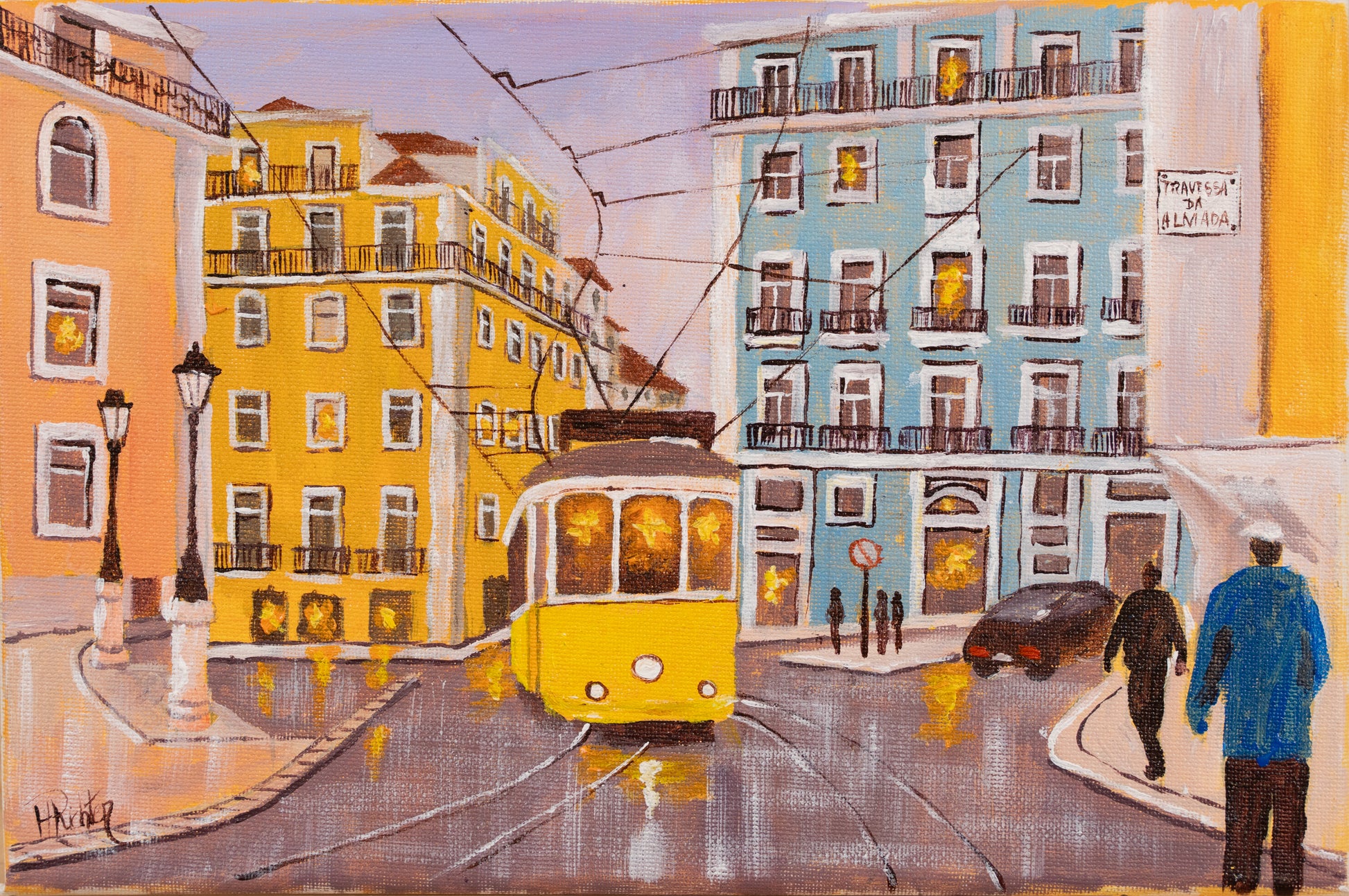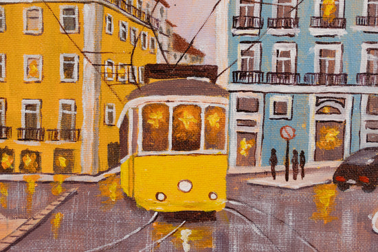 "Golden Hour in Lisbon" captures a serene urban scene at dusk with the iconic yellow tram gliding through the vibrant streets of Lisbon. The artist has masterfully rendered the historical architecture in warm tones of orange and yellow, reflecting the sunset's glow, contrasted with the cool shadows of the evening. The painting's perspective invites the viewer to stroll down the lively streets, immersing them in the city's charming atmosphere.