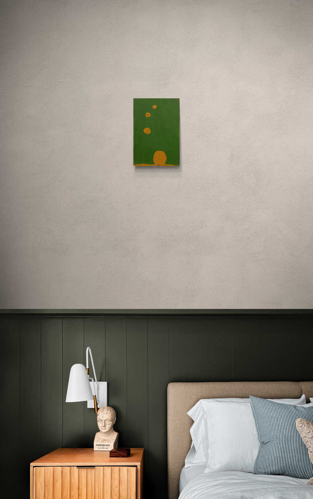 This abstract piece features golden orbs set against a vibrant green background. The simplicity of the forms and the use of contrasting colors create a visually compelling artwork.