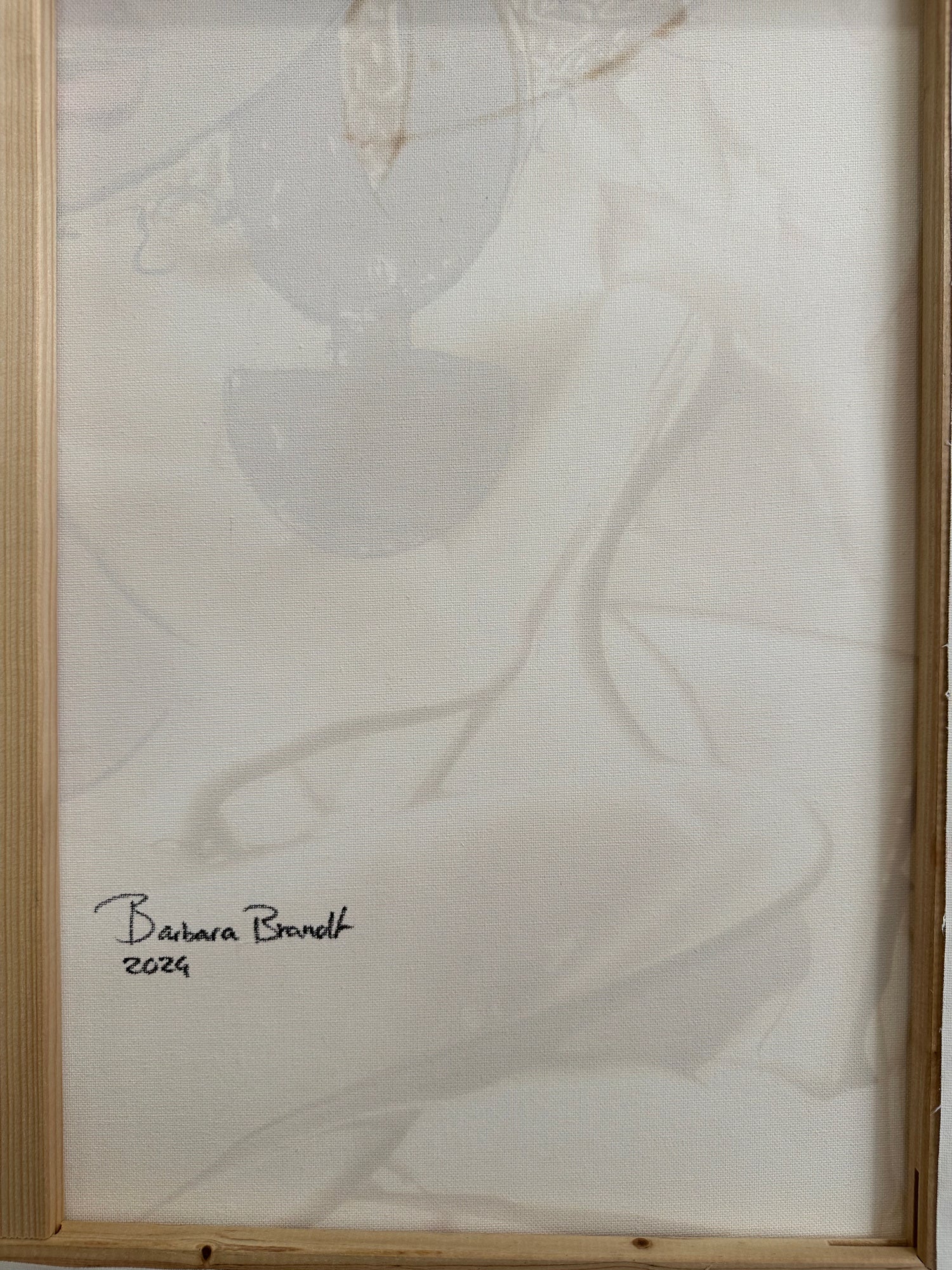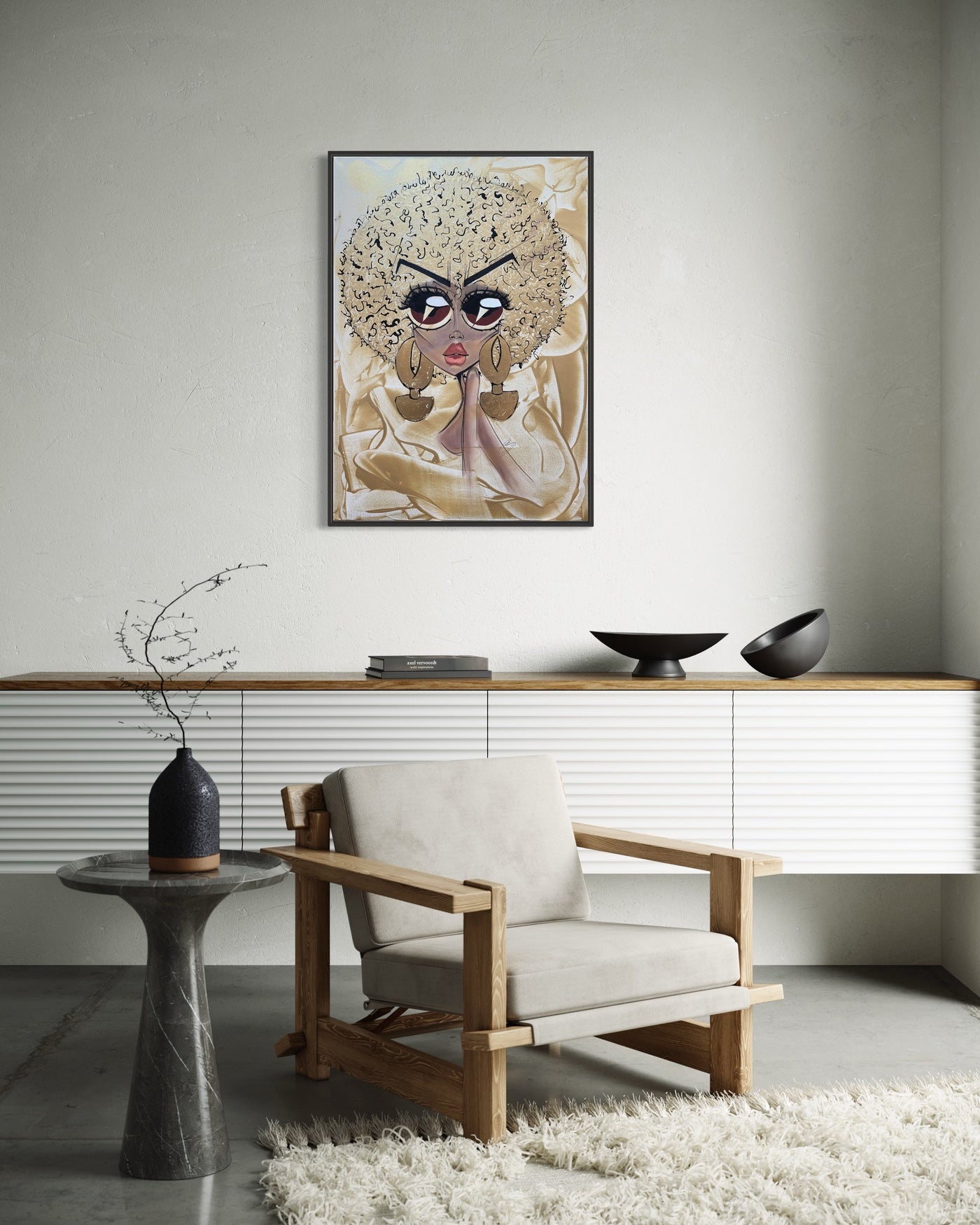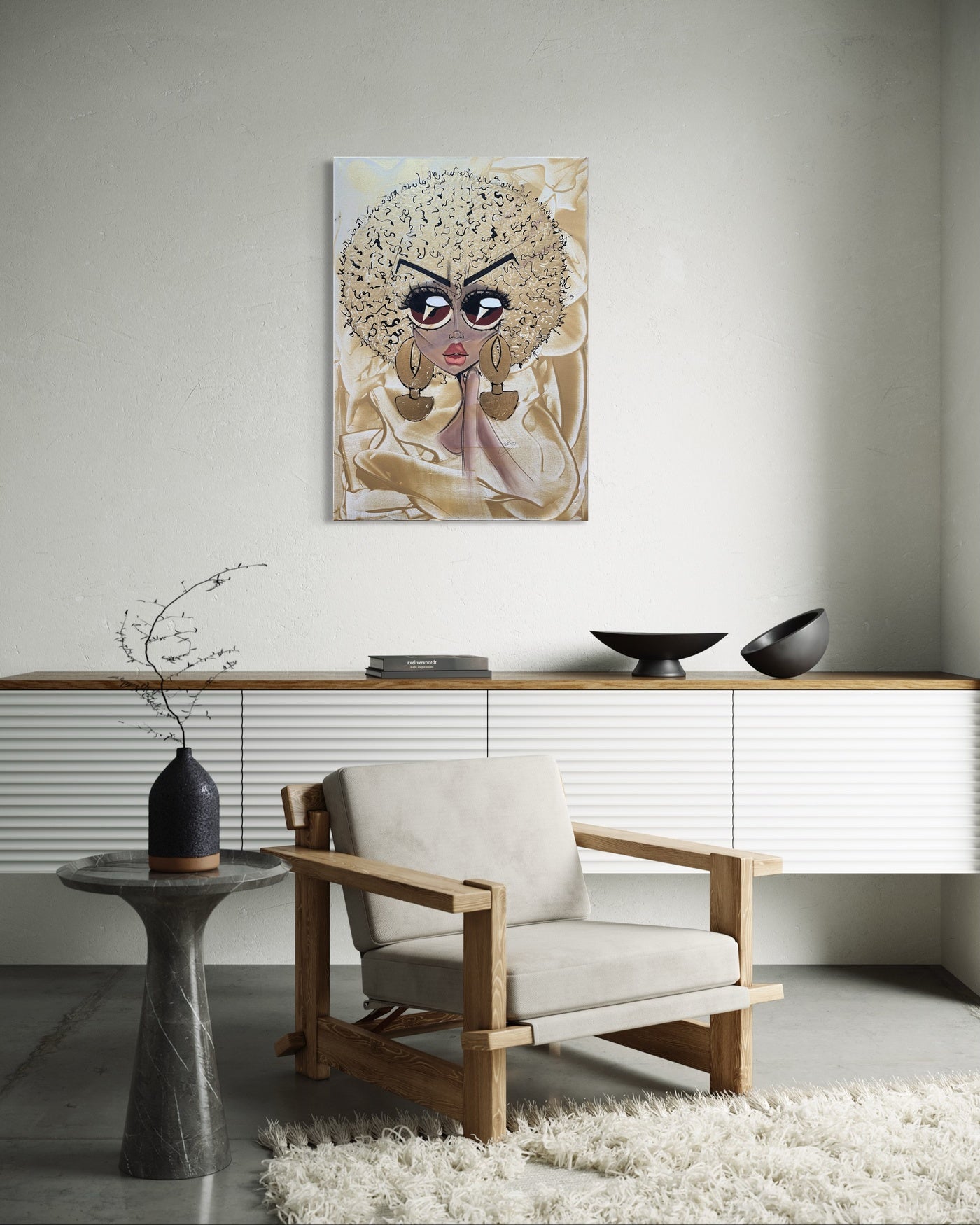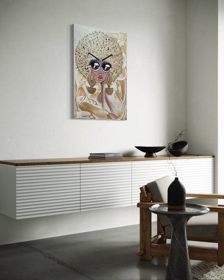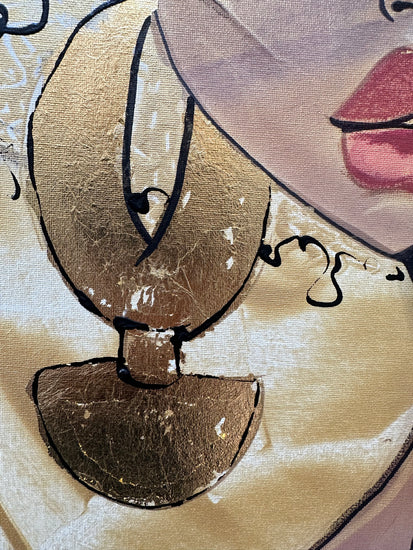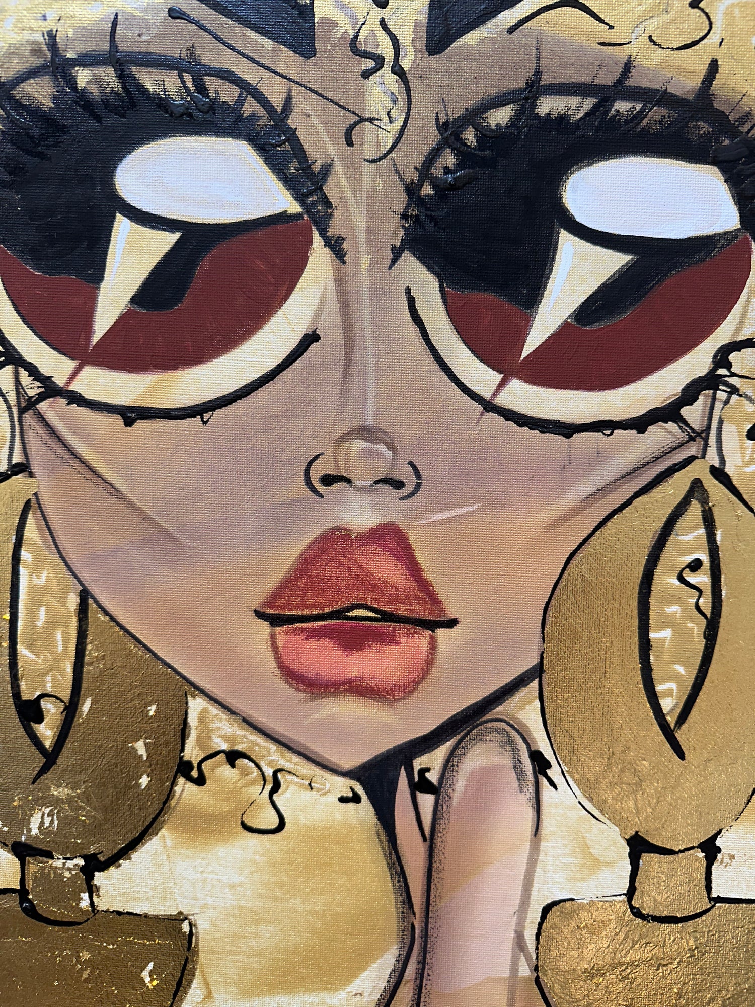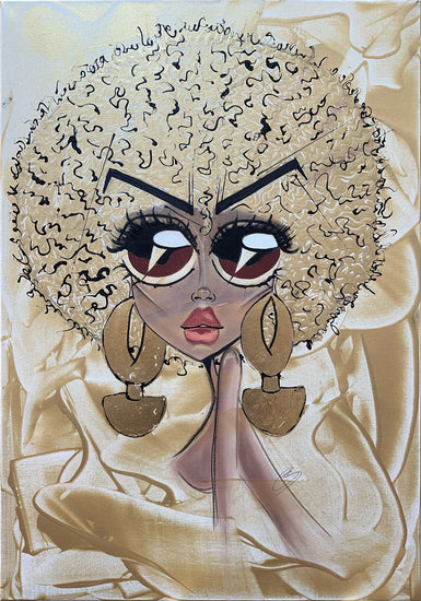 Barbara Brandt brings this golden woman with large expressive eyes, golden earrings, and an intricate curly hairstyle.