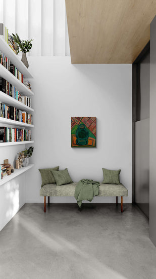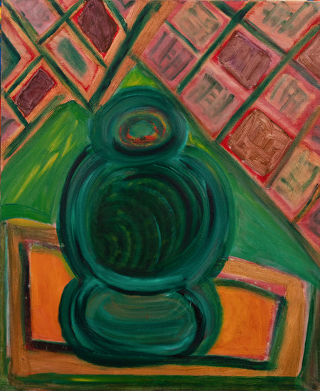 A vibrant, abstract representation of a mandala with intricate green and orange patterns. The bold lines and dynamic composition create a sense of movement and energy, reflecting the spiritual and meditative qualities of mandala art.