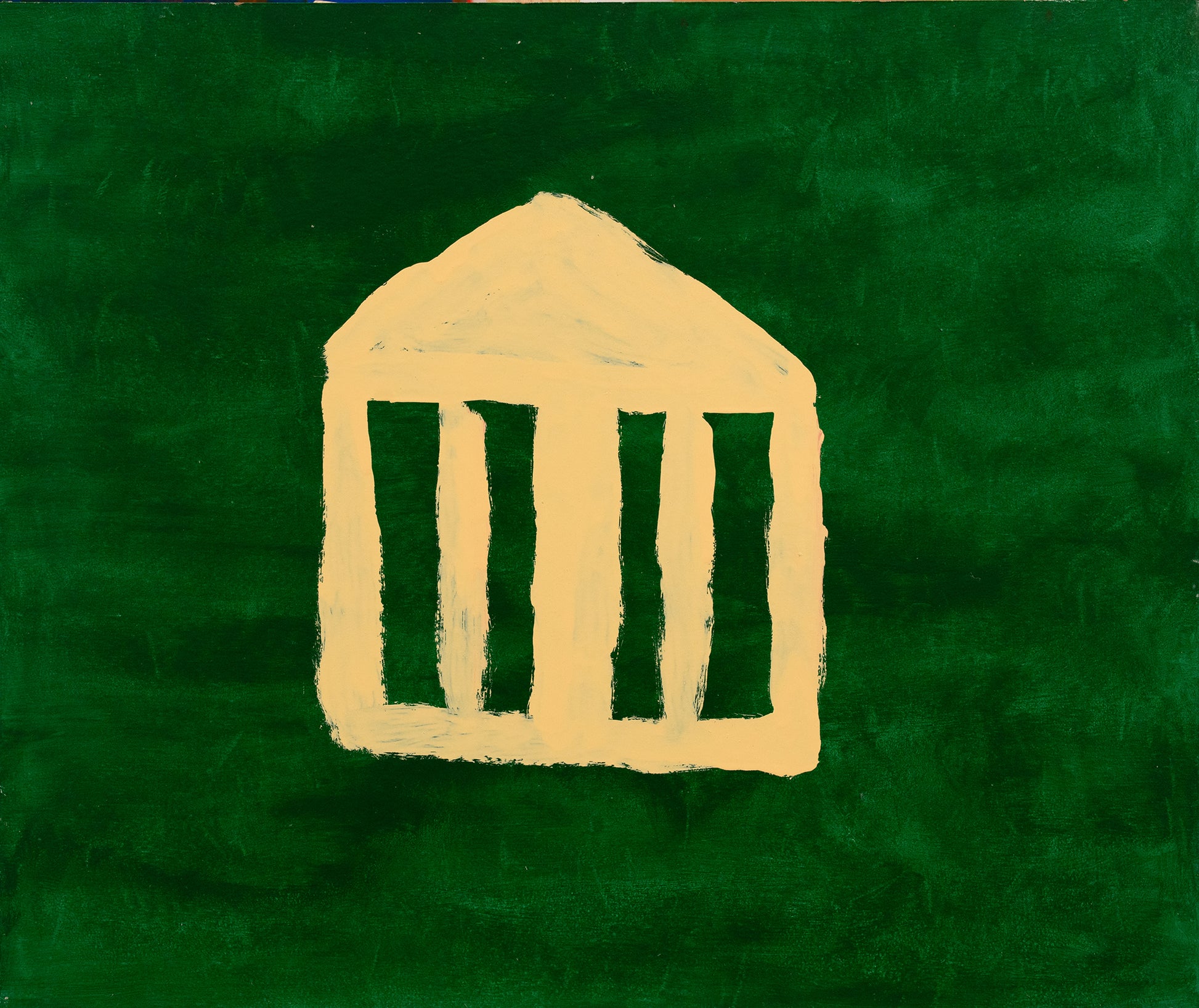 A minimalist and abstract depiction of a temple set against a deep green background. The simplicity of the design and the use of negative space create a powerful visual impact.