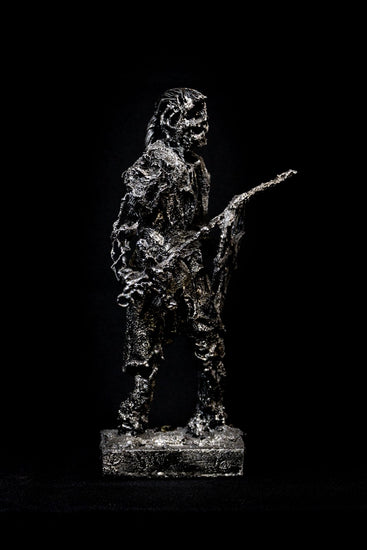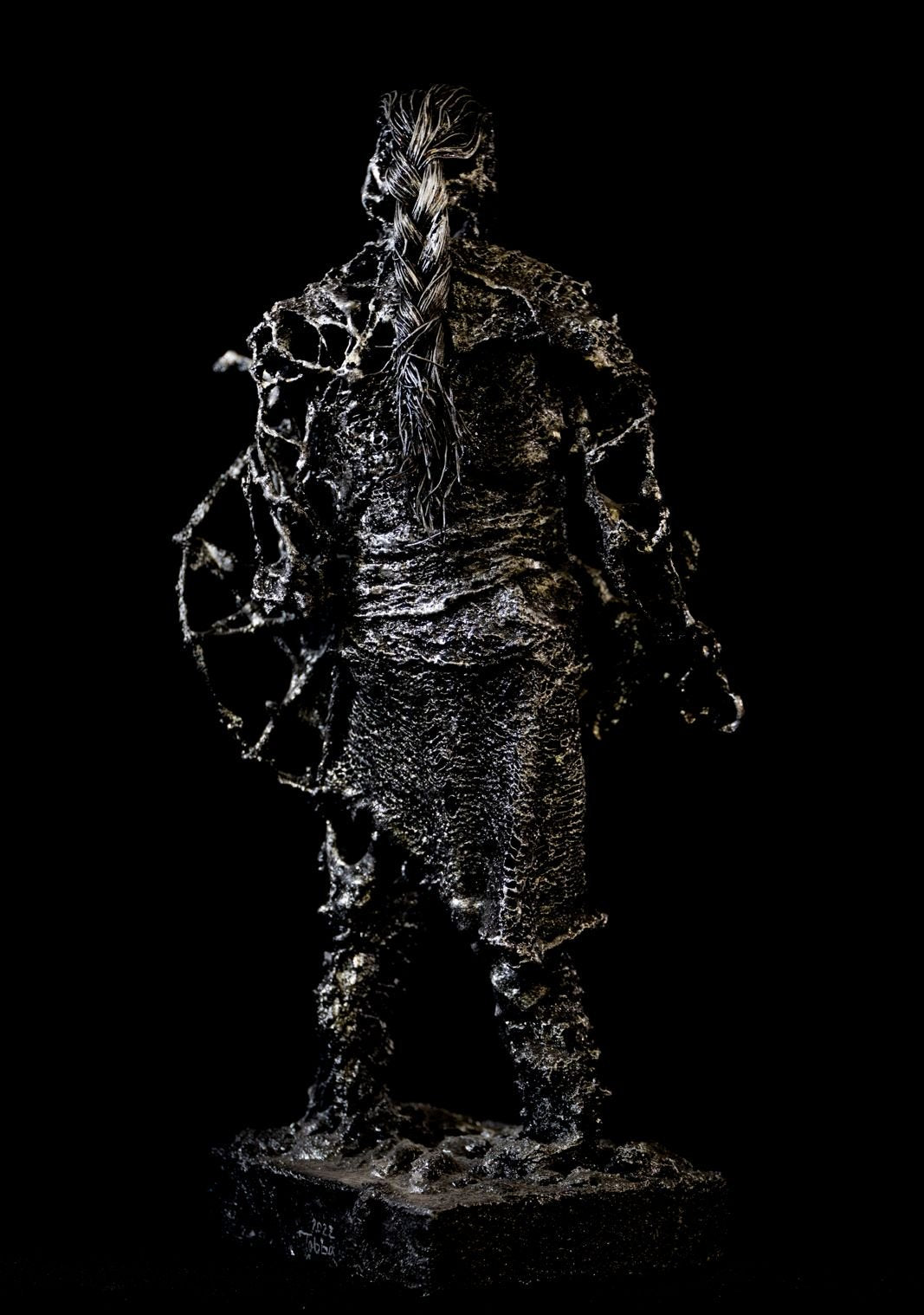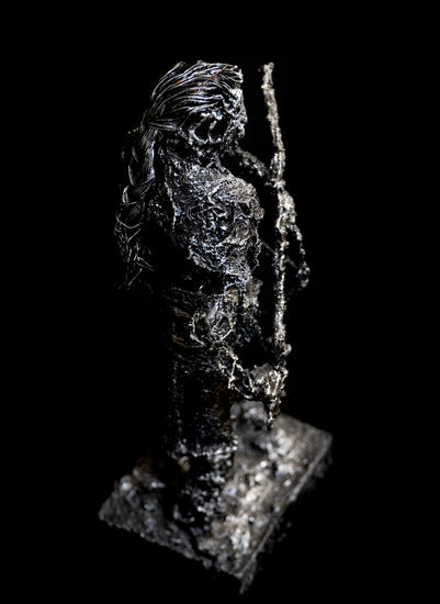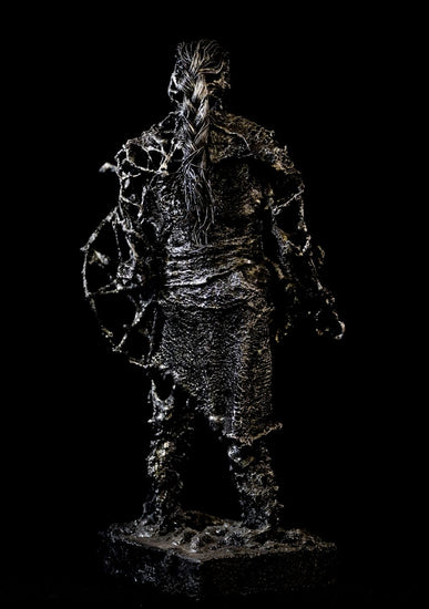 This hauntingly detailed sculpture, crafted with a copper wire, cement, and painted in black with metallic finish, depicts a battle-worn warrior standing resolute. The figure, draped in tattered armor, appears to have been shaped from the remnants of a battlefield, evoking a sense of ancient strength and endurance. The rugged, ash-like surface enhances the impression of age and wear, with the figure's intricate braid flowing down its back, adding a touch of humanity to the otherwise formidable presence. The dark background contrasts sharply with the silvery textures, amplifying the dramatic and raw power of the piece.