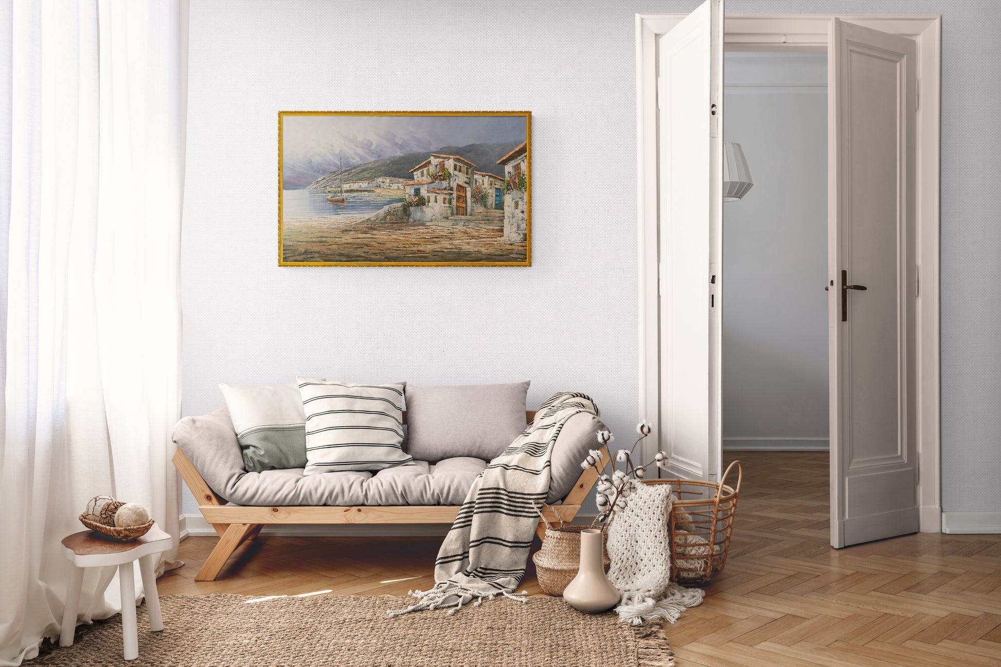 A picturesque harbor scene with rustic buildings lining the shore, a sailboat docked, and mountains in the background. The detailed textures and harmonious colors evoke a charming coastal village.
