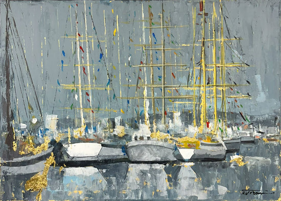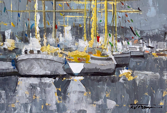 An atmospheric depiction of moored boats rendered in soft grays and punctuated by vibrant splashes of color and gold leaf.