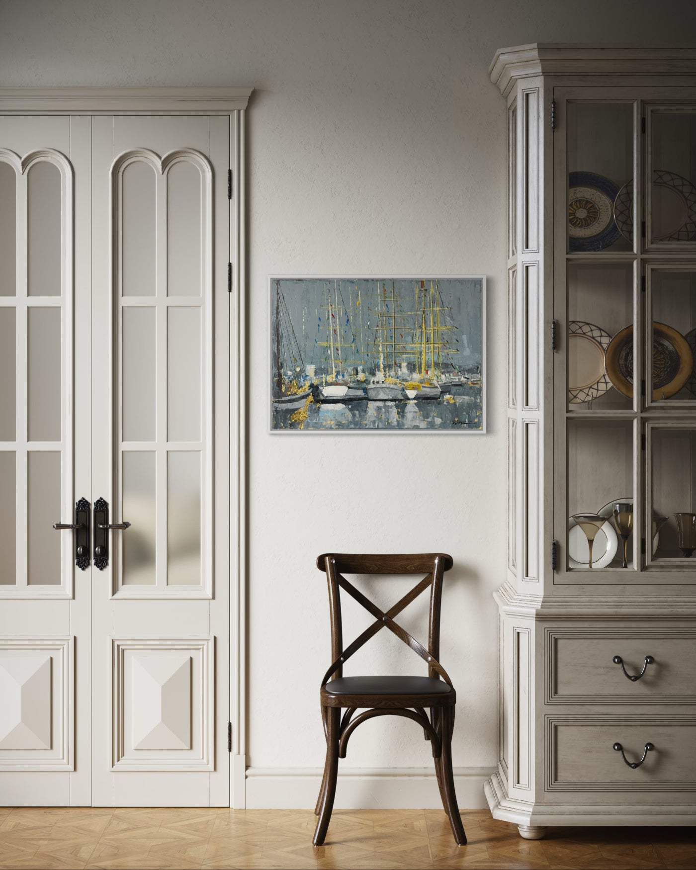 The layered brushstrokes evoke the gentle motion of the water, while the shimmering metallic details lend a refined, contemporary edge to this abstract harbor scene.