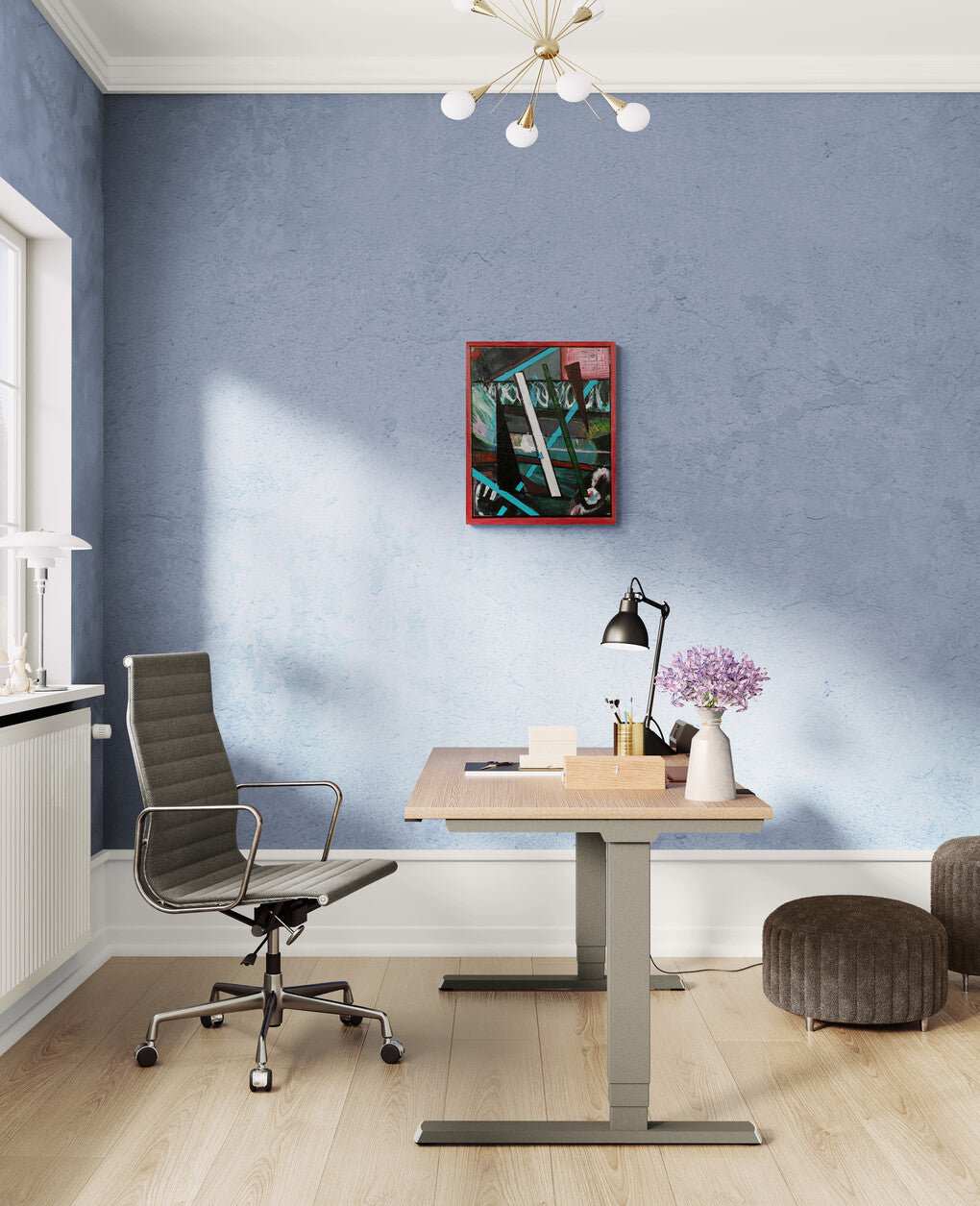 This painting presents a bold and vibrant composition of geometric shapes dominated by shades of green, yellow, and white, accented with touches of blue and red. The shapes are arranged in a balanced yet dynamic manner, with triangular and rectangular forms intersecting and overlapping. The background is primarily green, giving the piece a grounded, earthy feel, while the red border frames the composition and adds a striking contrast. The use of blue diagonal lines running across the shapes adds a sense of direction and movement, guiding the viewer's eye through the artwork. The overall effect is one of harmony and energy, combining both structured and fluid elements in a cohesive design.