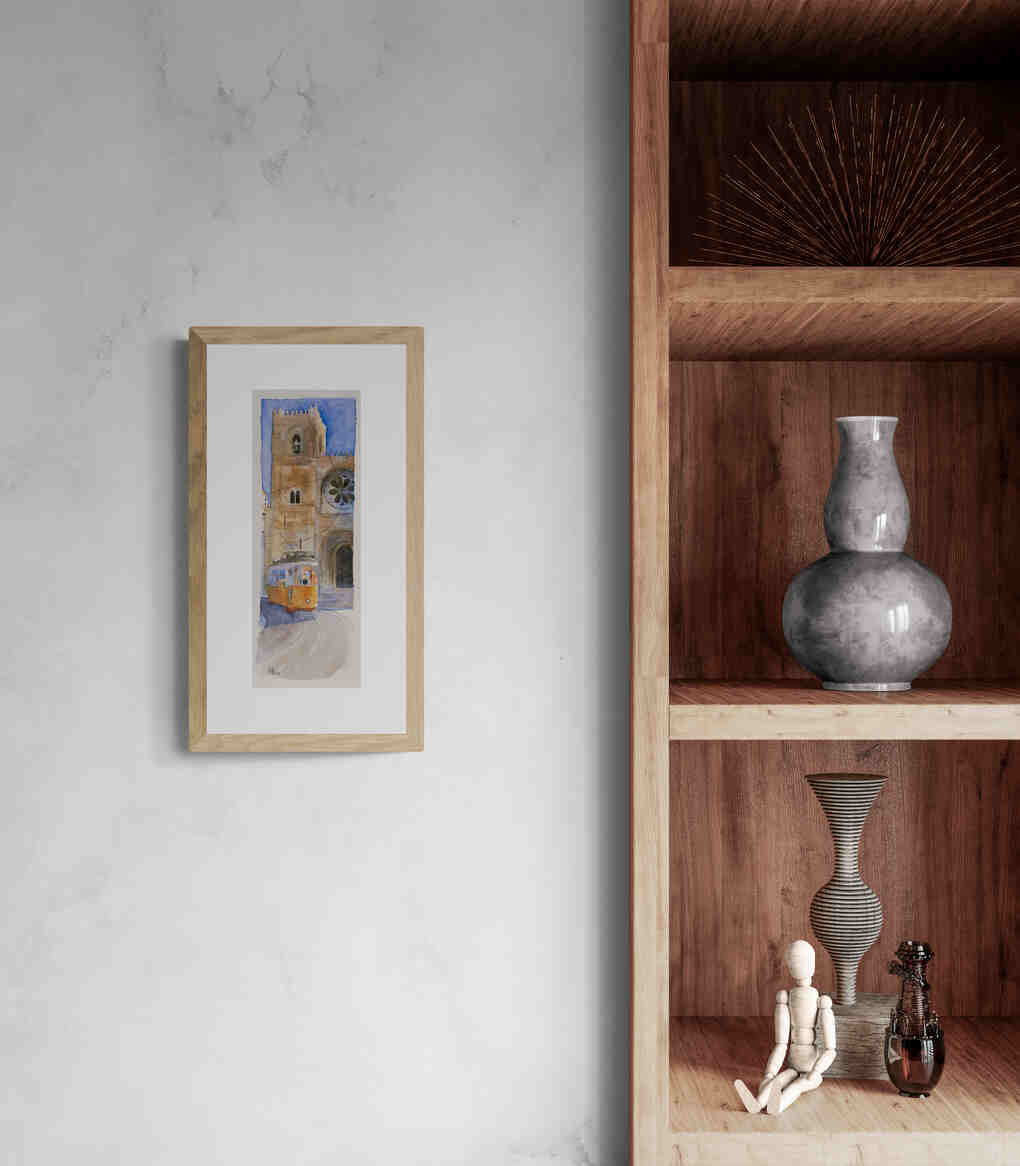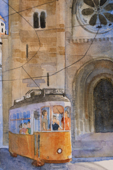 "Historic Route" is a stunning watercolor portrayal of a vibrant orange tram as it passes by a grand, historic church, symbolizing the intersection of daily modern life with the enduring splendor of historical architecture. The painting masterfully captures the architectural details of the church, including its intricate stonework and stained glass windows, juxtaposed against the simplicity and functionality of the tram. The deep blue sky adds a dramatic backdrop, enhancing the aged textures of the stone and the bright hues of the tram.