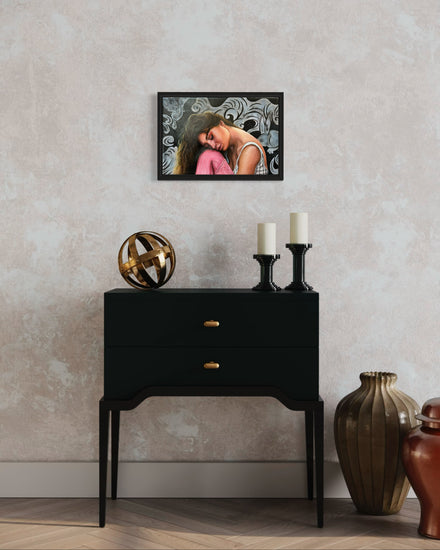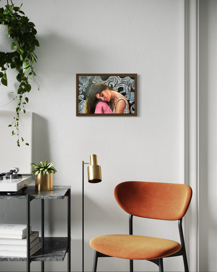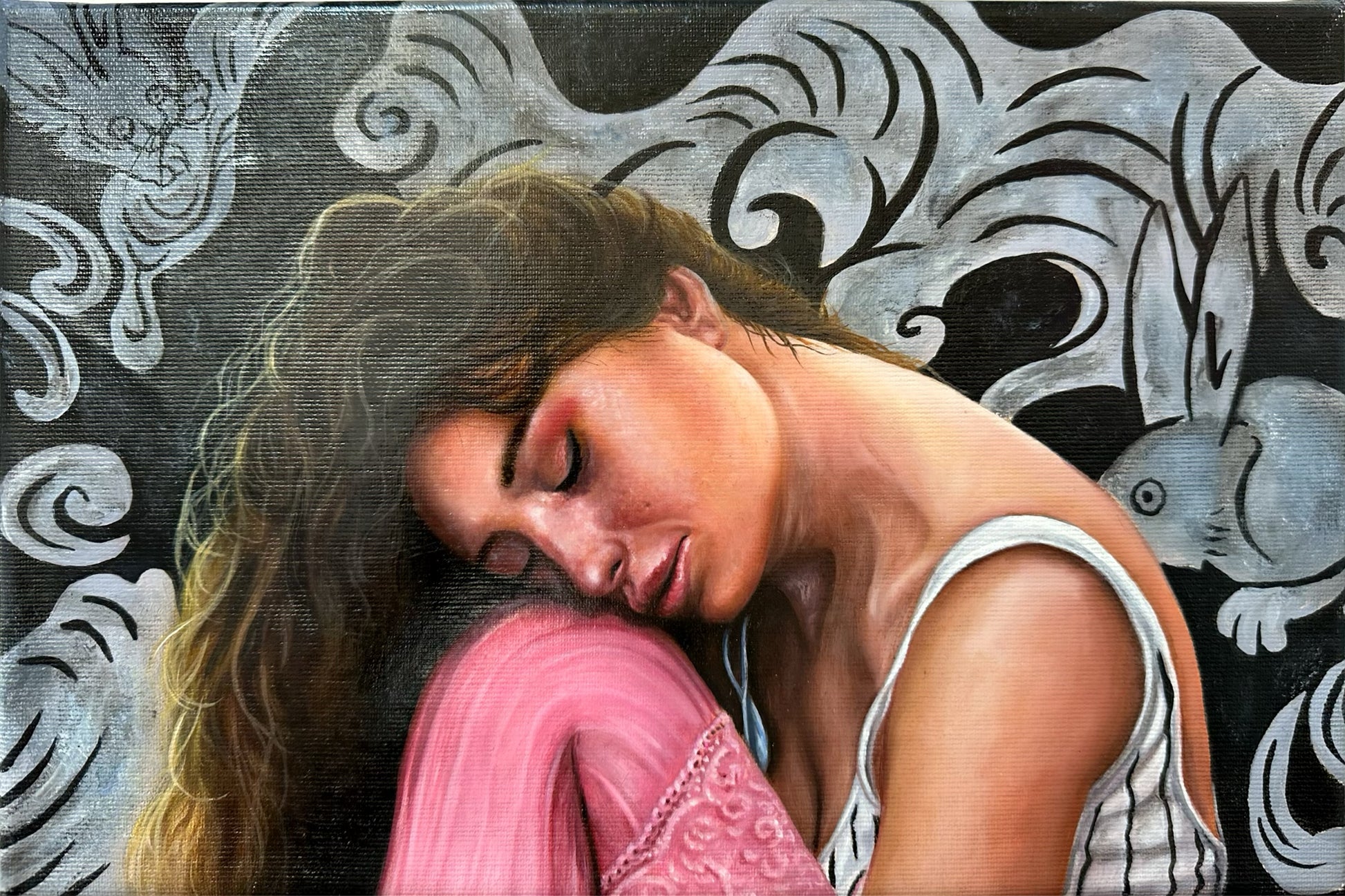A tender portrait of introspection, this painting captures a woman lost in reverie, resting quietly as fantastical creatures swirl behind her.